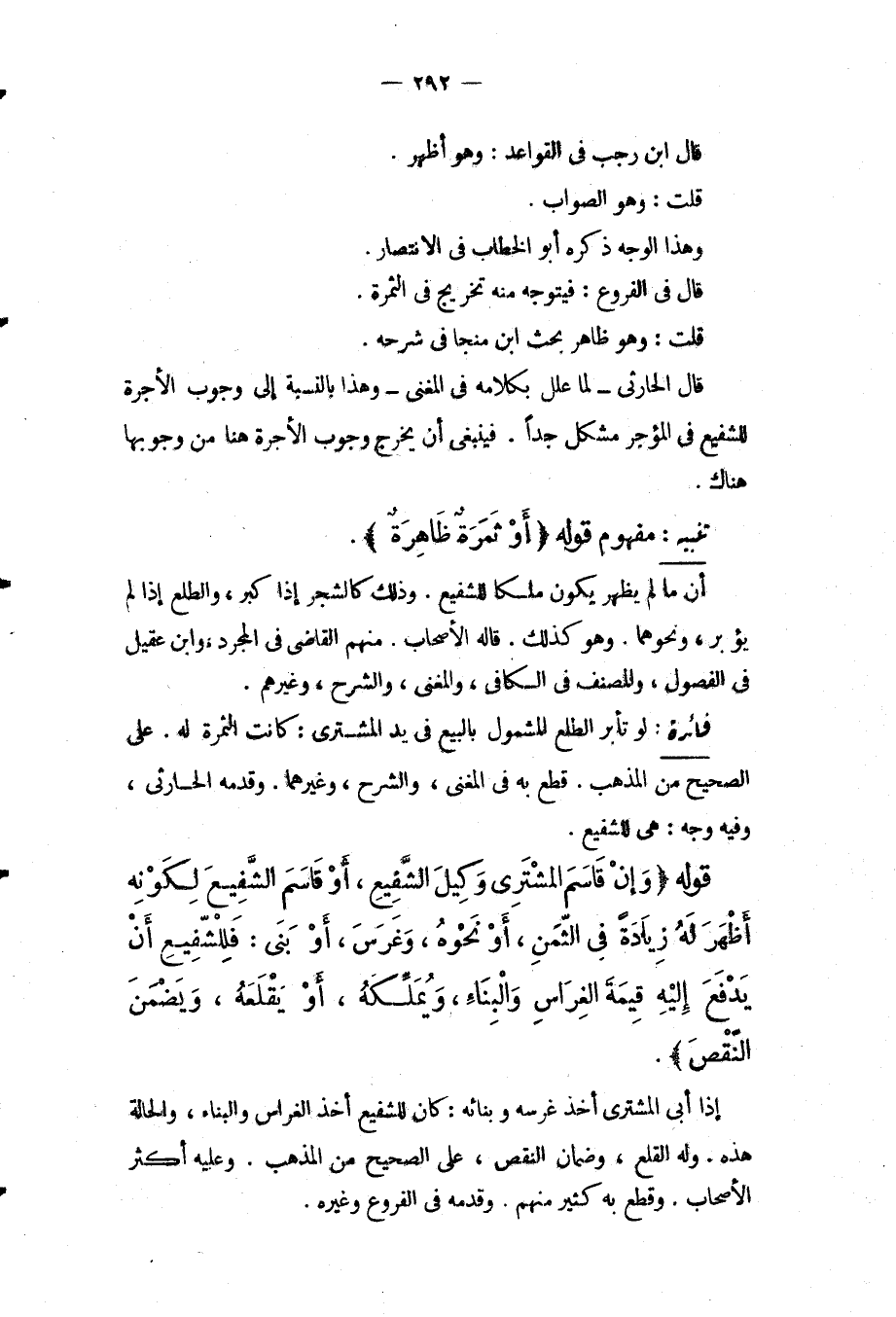 قَالَ ابْنُ رَجَبٍ فِي الْقَوَاعِدِ: وَهُوَ أَظْهَرُ. قُلْت: وَهُوَ الصَّوَابُ. وَهَذَا الْوَجْهُ ذَكَرَهُ أَبُو الْخَطَّابِ فِي الِانْتِصَارِ. قَالَ فِي الْفُرُوعِ: فَيَتَوَجَّهُ مِنْهُ تَخْرِيجٌ فِي الثَّمَرَةِ. قُلْت: وَهُوَ ظَاهِرُ بَحْثِ ابْنِ مُنَجَّا فِي شَرْحِهِ. قَالَ الْحَارِثِيُّ لَمَّا عَلَّلَ بِكَلَامِهِ فِي الْمُغْنِي وَهَذَا بِالنِّسْبَةِ إلَى وُجُوبِ الْأُجْرَةِ لِلشَّفِيعِ فِي الْمُؤَجَّرِ مُشْكِلٌ جِدًّا. فَيَنْبَغِي أَنْ يَخْرُجَ وُجُوبُ الْأُجْرَةِ هُنَا مِنْ وُجُوبِهَا هُنَاكَ.
