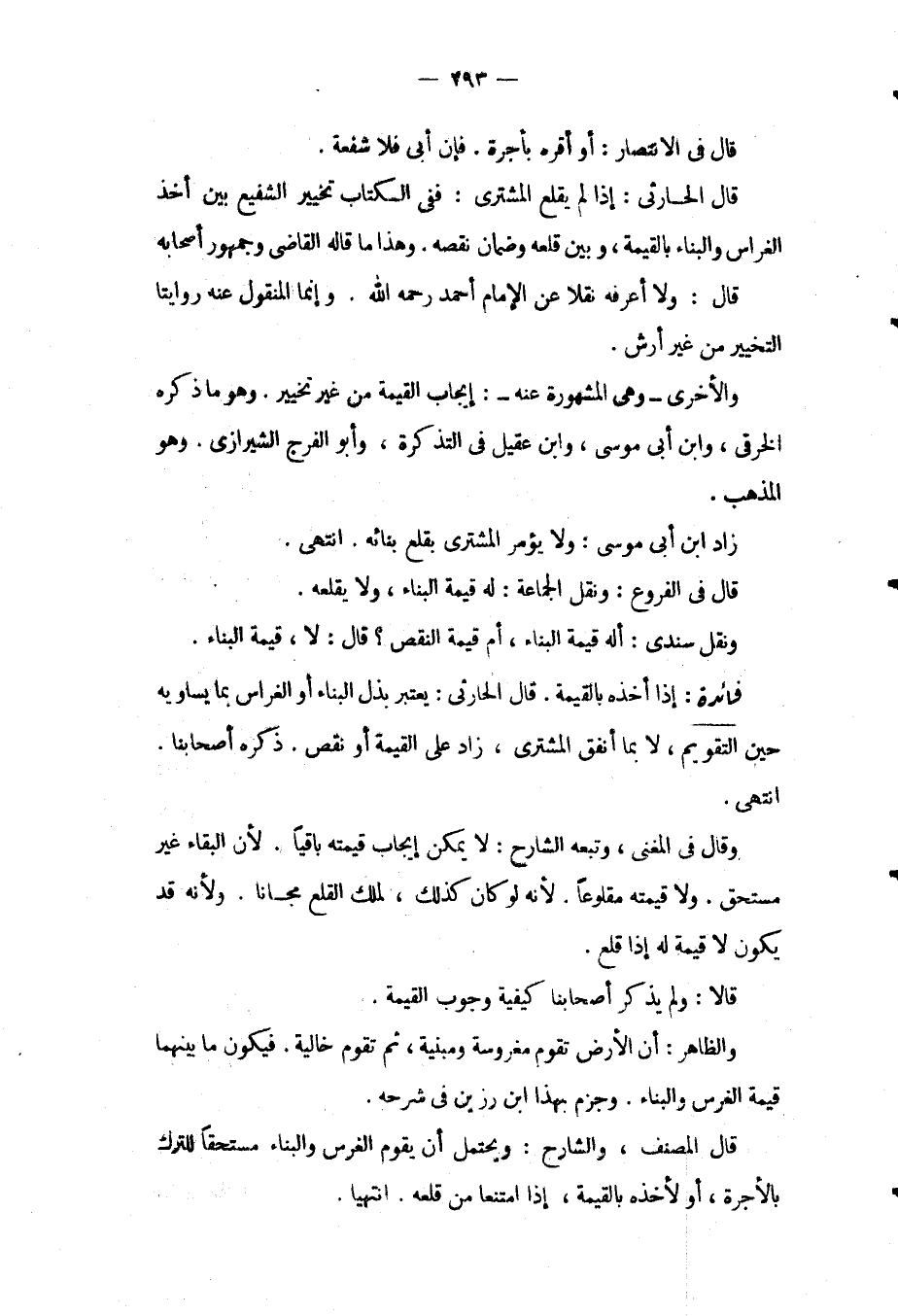 قَالَ فِي الِانْتِصَارِ: أَوْ أَقَرَّهُ بِأُجْرَةٍ. فَإِنْ أَبَى فَلَا شُفْعَةَ. قَالَ الْحَارِثِيُّ: إذَا لَمْ يَقْلَعْ الْمُشْتَرِي: فَفِي الْكِتَابِ تَخْيِيرُ الشَّفِيعِ بَيْنَ أَخْذِ الْغِرَاسِ وَالْبِنَاءِ بِالْقِيمَةِ، وَبَيْنَ قَلْعِهِ وَضَمَانِ نَقْصِهِ. وَهَذَا مَا قَالَهُ الْقَاضِي وَجُمْهُورُ أَصْحَابِهِ قَالَ: وَلَا أَعْرِفُهُ نَقْلًا عَنْ الْإِمَامِ أَحْمَدَ - رَحِمَهُ اللَّهُ -. وَإِنَّمَا الْمَنْقُولُ عَنْهُ رِوَايَتَانِ التَّخْيِيرُ مِنْ غَيْرِ أَرْشٍ. وَالْأُخْرَى وَهِيَ الْمَشْهُورَةُ عَنْهُ: إيجَابُ الْقِيمَةِ مِنْ غَيْرِ تَخْيِيرٍ. وَهُوَ مَا ذَكَرَهُ الْخِرَقِيُّ، وَابْنُ أَبِي مُوسَى، وَابْنُ عَقِيلٍ فِي التَّذْكِرَةِ، وَأَبُو الْفَرَجِ الشِّيرَازِيُّ. وَهُوَ الْمَذْهَبُ. زَادَ ابْنُ أَبِي مُوسَى: وَلَا يُؤْمَرُ الْمُشْتَرِي بِقَلْعِ بِنَائِهِ. انْتَهَى. قَالَ فِي الْفُرُوعِ: وَنَقَلَ الْجَمَاعَةُ: لَهُ قِيمَةُ الْبِنَاءِ، وَلَا يَقْلَعُهُ. وَنَقَلَ سِنْدِيٌّ: أَلَهُ قِيمَةُ الْبِنَاءِ، أَمْ قِيمَةُ النَّقْصِ؟ قَالَ: لَا، قِيمَةُ الْبِنَاءِ.