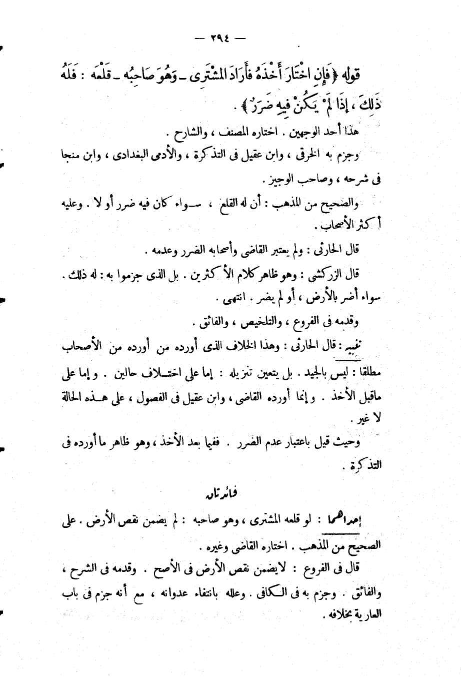 تَنْبِيهٌ: قَالَ الْحَارِثِيُّ: وَهَذَا الْخِلَافُ الَّذِي أَوْرَدَهُ مَنْ أَوْرَدَهُ مِنْ الْأَصْحَابِ مُطْلَقًا: لَيْسَ بِالْجَيِّدِ. بَلْ يَتَعَيَّنُ تَنْزِيلُهُ: إمَّا عَلَى اخْتِلَافِ حَالَيْنِ. وَإِمَّا عَلَى مَا قَبْلَ الْأَخْذِ. وَإِنَّمَا أَوْرَدَهُ الْقَاضِي، وَابْنُ عَقِيلٍ فِي الْفُصُولِ، عَلَى هَذِهِ الْحَالَةِ لَا غَيْرُ. وَحَيْثُ قِيلَ بِاعْتِبَارِ عَدَمِ الضَّرَرِ. فَفِيمَا بَعْدَ الْأَخْذِ، وَهُوَ ظَاهِرُ مَا أَوْرَدَهُ فِي التَّذْكِرَةِ.