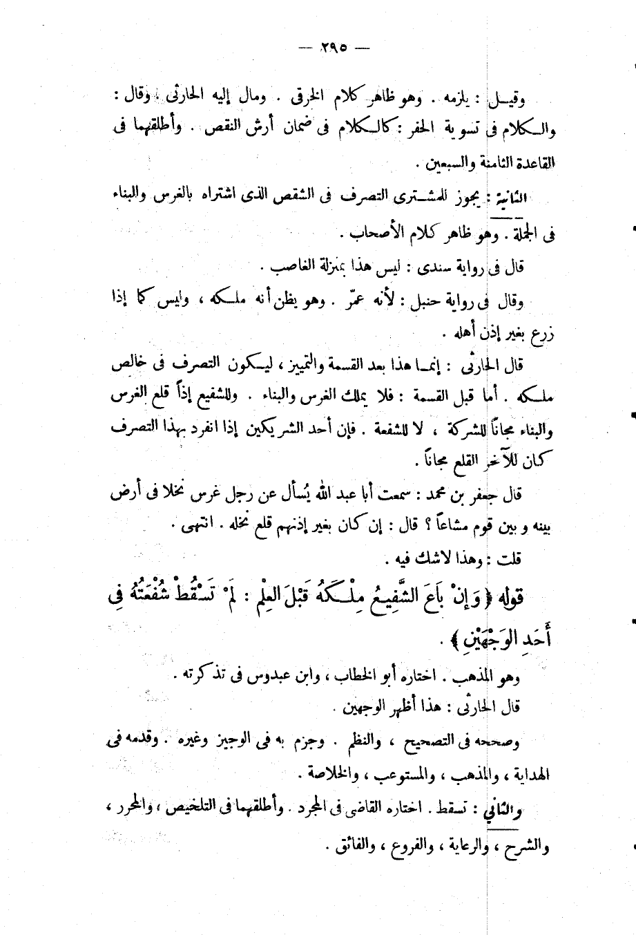 الثَّانِيَةُ: يَجُوزُ لِلْمُشْتَرِي التَّصَرُّفُ فِي الشِّقْصِ الَّذِي اشْتَرَاهُ بِالْغَرْسِ وَالْبِنَاءِ فِي الْجُمْلَةِ. وَهُوَ ظَاهِرُ كَلَامِ الْأَصْحَابِ. قَالَ فِي رِوَايَةِ سِنْدِيٍّ: لَيْسَ هَذَا بِمَنْزِلَةِ الْغَاصِبِ. وَقَالَ فِي رِوَايَةِ حَنْبَلٍ: لِأَنَّهُ عَمَّرَ. وَهُوَ يَظُنُّ أَنَّهُ مِلْكًا، وَلَيْسَ كَمَا إذَا زَرَعَ بِغَيْرِ إذْنِ أَهْلِهِ. قَالَ الْحَارِثِيُّ: إنَّمَا هَذَا بَعْدَ الْقِسْمَةِ وَالتَّمْيِيزِ، لِيَكُونَ التَّصَرُّفُ فِي خَالِصِ. مِلْكِهِ. أَمَّا قَبْلَ الْقِسْمَةِ: فَلَا يَمْلِكُ الْغَرْسَ وَالْبِنَاءَ. وَلِلشَّفِيعِ إذَا قَلَعَ الْغَرْسَ وَالْبِنَاءَ مَجَّانًا لِلشَّرِكَةِ، لَا لِلشُّفْعَةِ. فَإِنَّ أَحَدَ الشَّرِيكَيْنِ إذَا انْفَرَدَ بِهَذَا التَّصَرُّفِ كَانَ لِلْآخَرِ الْقَلْعُ مَجَّانًا. قَالَ جَعْفَرُ بْنُ مُحَمَّدٍ: سَمِعْت أَبَا عَبْدِ اللَّهِ يُسْأَلُ عَنْ رَجُلٍ غَرَسَ نَخْلًا فِي أَرْضٍ بَيْنَهُ وَبَيْنَ قَوْمٍ مُشَاعًا؟ قَالَ: إنْ كَانَ بِغَيْرِ إذْنِهِمْ قَلَعَ نَخْلَهُ. انْتَهَى. قُلْت: وَهَذَا لَا شَكَّ فِيهِ.