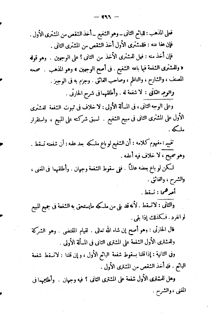 وَالْوَجْهُ الثَّانِي: لَا شُفْعَةَ لَهُ. وَأَطْلَقَهُمَا فِي شَرْحِ الْحَارِثِيِّ. وَعَلَى الْوَجْهِ الثَّانِي، فِي الْمَسْأَلَةِ الْأُولَى: لَا خِلَافَ فِي ثُبُوتِ الشُّفْعَةِ لِلْمُشْتَرِي الْأَوَّلِ عَلَى الْمُشْتَرِي الثَّانِي فِي مَبِيعِ الشَّفِيعِ. لِسَبْقِ شَرِكَتِهِ عَلَى الْمَبِيعِ، وَاسْتِقْرَارِ مِلْكِهِ.