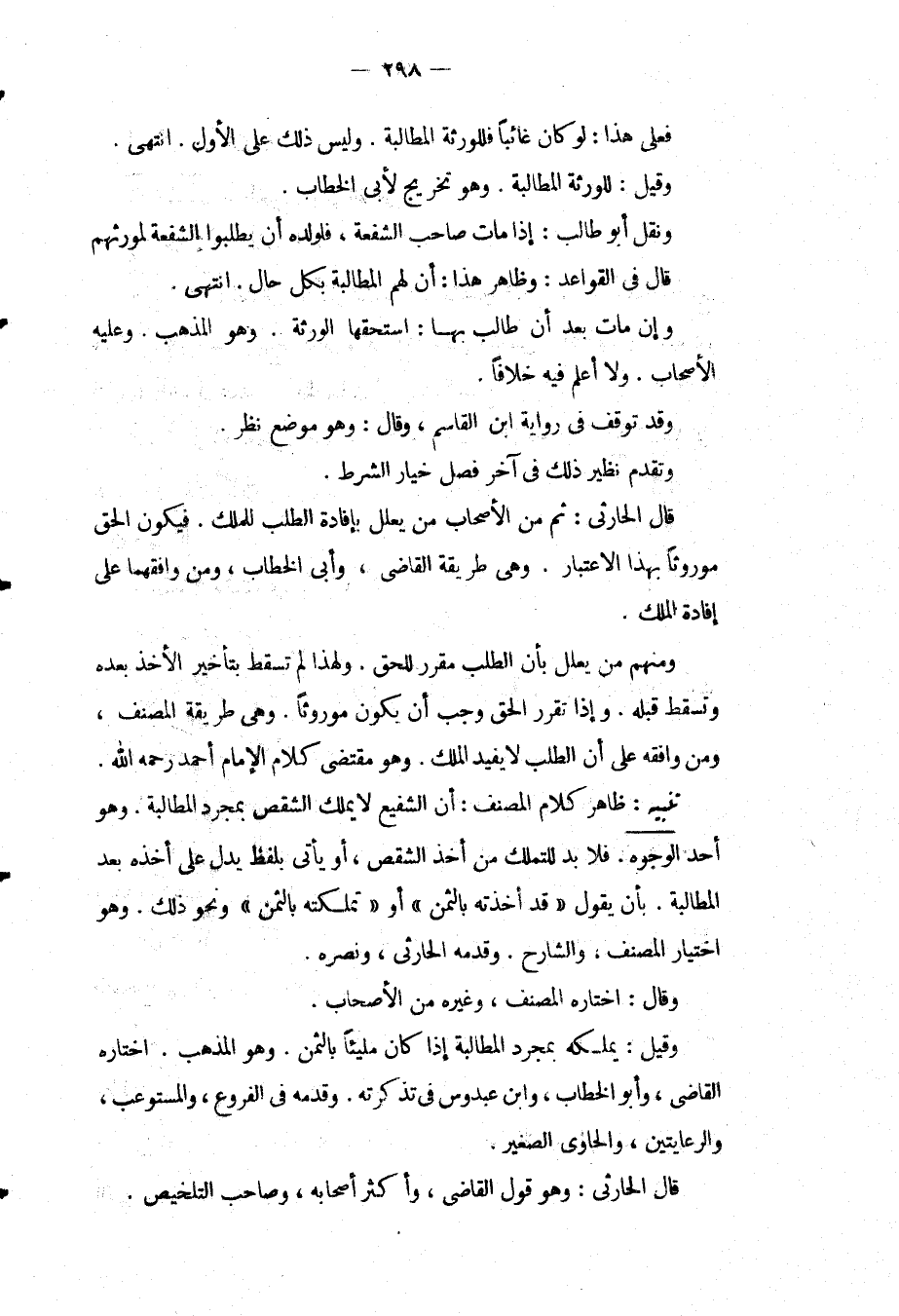فَعَلَى هَذَا: لَوْ كَانَ غَائِبًا فَلِلْوَرَثَةِ الْمُطَالَبَةُ. وَلَيْسَ ذَلِكَ عَلَى الْأَوَّلِ. انْتَهَى. وَقِيلَ: لِلْوَرَثَةِ الْمُطَالَبَةُ. وَهُوَ تَخْرِيجٌ لِأَبِي الْخَطَّابِ. وَنَقَلَ أَبُو طَالِبٍ: إذَا مَاتَ صَاحِبُ الشُّفْعَةِ، فَلِوَلَدِهِ أَنْ يَطْلُبُوا الشُّفْعَةَ لِمُوَرِّثِهِمْ قَالَ فِي الْقَوَاعِدِ: وَظَاهِرُ هَذَا: أَنَّ لَهُمْ الْمُطَالَبَةَ بِكُلِّ حَالٍ. انْتَهَى. وَإِنْ مَاتَ بَعْدَ أَنْ طَالَبَ بِهَا: اسْتَحَقَّهَا الْوَرَثَةُ. وَهُوَ الْمَذْهَبُ. وَعَلَيْهِ الْأَصْحَابُ. وَلَا أَعْلَمُ فِيهِ خِلَافًا. وَقَدْ تَوَقَّفَ فِي رِوَايَةِ ابْنِ الْقَاسِمِ، وَقَالَ: وَهُوَ مَوْضِعُ نَظَرٍ. وَتَقَدَّمَ نَظِيرُ ذَلِكَ فِي آخِرِ فَصْلِ خِيَارِ الشَّرْطِ. قَالَ الْحَارِثِيُّ: ثُمَّ مِنْ الْأَصْحَابِ مَنْ يُعَلِّلُ بِإِفَادَةِ الطَّلَبِ لِلْمِلْكِ. فَيَكُونُ الْحَقُّ مَوْرُوثًا بِهَذَا الِاعْتِبَارِ. وَهِيَ طَرِيقَةُ الْقَاضِي، وَأَبِي الْخَطَّابِ، وَمَنْ وَافَقَهُمَا عَلَى إفَادَةِ الْمِلْكِ. وَمِنْهُمْ مَنْ يُعَلِّلُ بِأَنَّ الطَّلَبَ مُقَرِّرٌ لِلْحَقِّ. وَلِهَذَا لَمْ تَسْقُطْ بِتَأْخِيرِ الْأَخْذِ بِعِدَّةٍ وَتَسْقُطُ قَبْلَهُ. وَإِذَا تَقَرَّرَ الْحَقُّ وَجَبَ أَنْ يَكُونَ مَوْرُوثًا. وَهِيَ طَرِيقَةُ الْمُصَنِّفِ، وَمَنْ وَافَقَهُ عَلَى أَنَّ الطَّلَبَ لَا يُفِيدُ الْمِلْكَ. وَهُوَ مُقْتَضَى كَلَامِ الْإِمَامِ أَحْمَدَ - رَحِمَهُ اللَّهُ -.
