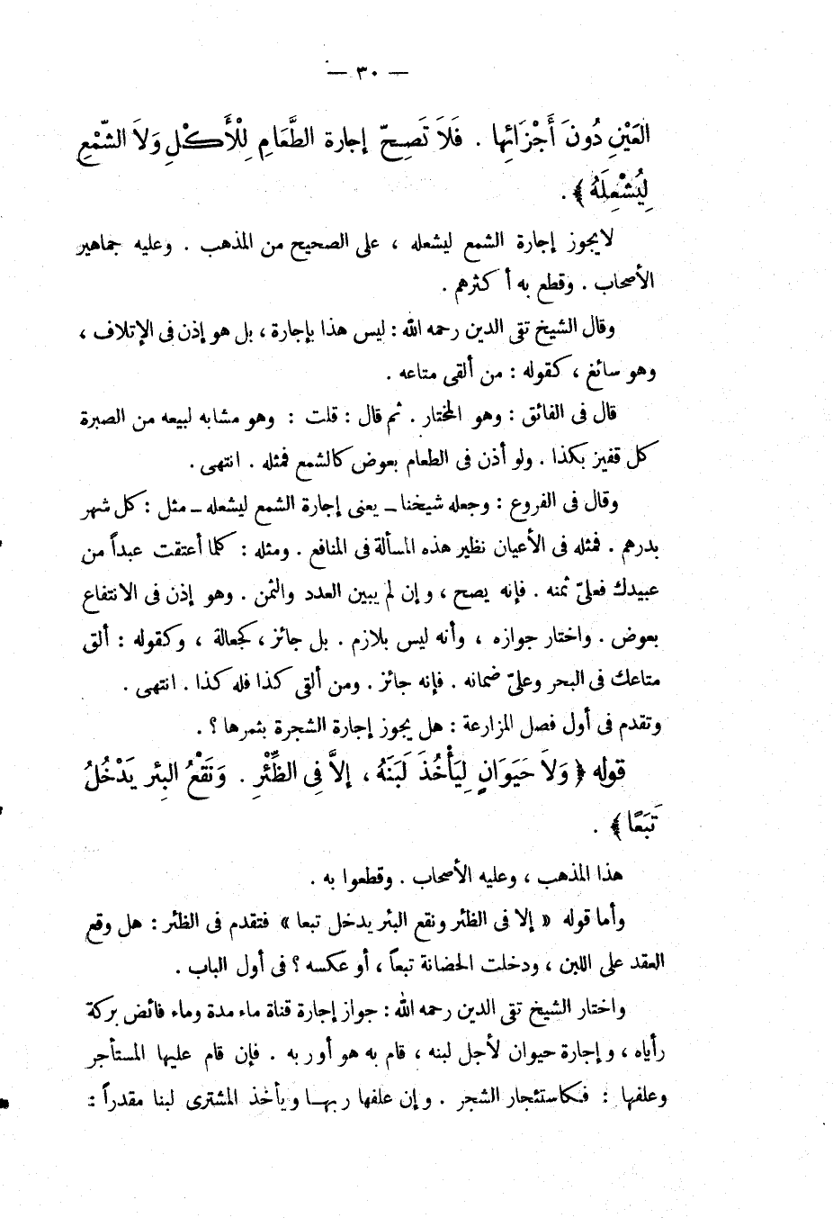 الْعَيْنِ دُونَ أَجْزَائِهَا. فَلَا تَصِحُّ إجَارَةُ الطَّعَامِ لِلْأَكْلِ وَلَا الشَّمْعِ لِيُشْعِلَهُ) . لَا يَجُوزُ إجَارَةُ الشَّمْعِ لِيُشْعِلَهُ، عَلَى الصَّحِيحِ مِنْ الْمَذْهَبِ وَعَلَيْهِ جَمَاهِيرُ الْأَصْحَابِ. وَقَطَعَ بِهِ أَكْثَرُهُمْ. وَقَالَ الشَّيْخُ تَقِيُّ الدِّينِ - رَحِمَهُ اللَّهُ -: لَيْسَ هَذَا بِإِجَارَةٍ، بَلْ هُوَ إذْنٌ فِي الْإِتْلَافِ، وَهُوَ سَائِغٌ، كَقَوْلِهِ: مَنْ أَلْقَى مَتَاعَهُ. قَالَ فِي الْفَائِقِ: وَهُوَ الْمُخْتَارُ. ثُمَّ قَالَ: قُلْت: وَهُوَ مُشَابِهٌ لِبَيْعِهِ مِنْ الصُّبْرَةِ كُلَّ قَفِيزٍ بِكَذَا. وَلَوْ أَذِنَ فِي الطَّعَامِ بِعِوَضٍ كَالشَّمْعِ فَمِثْلُهُ. انْتَهَى. وَقَالَ فِي الْفُرُوعِ: وَجَعَلَهُ شَيْخُنَا يَعْنِي إجَارَةَ الشَّمْعِ لِيُشْعِلَهُ مِثْلَ: كُلِّ شَهْرٍ بِدِرْهَمٍ. فَمِثْلُهُ فِي الْأَعْيَانِ نَظِيرُ هَذِهِ الْمَسْأَلَةِ فِي الْمَنَافِعِ. وَمِثْلُهُ: كُلَّمَا أَعْتَقْت عَبْدًا مِنْ عَبِيدِك فَعَلَيَّ ثَمَنُهُ. فَإِنَّهُ يَصِحُّ، وَإِنْ لَمْ يُبَيِّنْ الْعَدَدَ وَالثَّمَنَ. وَهُوَ إذْنٌ فِي الِانْتِفَاعِ بِعِوَضٍ. وَاخْتَارَ جَوَازَهُ، وَأَنَّهُ لَيْسَ بِلَازِمٍ. بَلْ جَائِزٌ كَجَعَالَةٍ، وَكَقَوْلِهِ: أَلْقِ مَتَاعَك فِي الْبَحْرِ وَعَلَيَّ ضَمَانُهُ. فَإِنَّهُ جَائِزٌ. وَمَنْ أَلْقَى كَذَا فَلَهُ كَذَا. انْتَهَى. وَتَقَدَّمَ فِي أَوَّلِ فَصْلِ الْمُزَارَعَةِ: هَلْ يَجُوزُ إجَارَةُ الشَّجَرَةِ بِثَمَرِهَا؟ .
