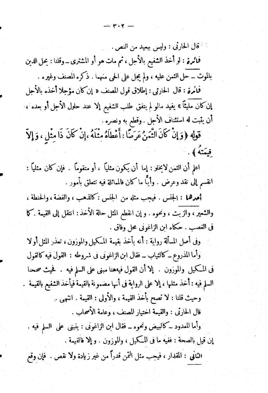 فَائِدَةٌ: قَالَ الْحَارِثِيُّ: إطْلَاقُ قَوْلِ الْمُصَنِّفِ " إنْ كَانَ مُؤَجَّلًا أَخَذَهُ بِالْأَجَلِ إنْ كَانَ مَلِيئًا " يُفِيدُ مَا لَوْ لَمْ يَتَّفِقْ طَلَبُ الشَّفِيعِ إلَّا عِنْدَ حُلُولِ الْأَجَلِ أَوْ بَعْدَهُ، أَنْ يَثْبُتَ لَهُ اسْتِئْنَافُ الْأَجَلِ. وَقَطَعَ بِهِ وَنَصَرَهُ. قَوْلُهُ (وَإِنْ كَانَ الثَّمَنُ عَرَضًا: أَعْطَاهُ مِثْلَهُ، إنْ كَانَ ذَا مِثْلٍ، وَإِلَّا قِيمَتَهُ) . اعْلَمْ أَنَّ الثَّمَنَ لَا يَخْلُو: إمَّا أَنْ يَكُونَ مِثْلِيًّا، أَوْ مُتَقَوِّمًا. فَإِنْ كَانَ مِثْلِيًّا: انْقَسَمَ إلَى نَقْدٍ وَعَرَضٍ. وَأَيَّا مَا كَانَ فَالْمُمَاثَلَةُ فِيهِ تَتَعَلَّقُ بِأُمُورٍ.