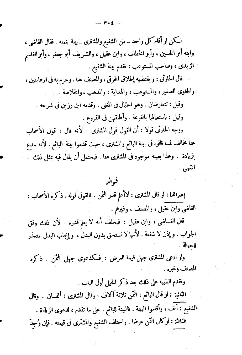 فَوَائِدُ: إحْدَاهُمَا: لَوْ قَالَ الْمُشْتَرِي: لَا أَعْلَمُ قَدْرَ الثَّمَنِ. فَالْقَوْلُ قَوْلُهُ. ذَكَرَهُ الْأَصْحَابُ: الْقَاضِي وَابْنُ عَقِيلٍ، وَالْمُصَنِّفُ، وَغَيْرُهُمْ. قَالَ الْقَاضِي، وَابْنُ عَقِيلٍ: فَيَحْلِفُ أَنَّهُ لَا يَعْلَمُ قَدْرَهُ. لِأَنَّ ذَلِكَ وَفْقُ الْجَوَابِ. وَإِذَنْ لَا شُفْعَةَ. لِأَنَّهَا لَا تُسْتَحَقُّ بِدُونِ الْبَدَلِ، وَإِيجَابُ الْبَدَلِ مُتَعَذِّرٌ لِلْجَهَالَةِ. لَوْ ادَّعَى الْمُشْتَرِي جَهْلَ قِيمَةِ الْعَرَضِ: فَكَدَعْوَى جَهْلِ الثَّمَنِ. ذَكَرَهُ الْمُصَنِّفُ وَغَيْرُهُ. وَتَقَدَّمَ التَّنْبِيهُ عَلَى ذَلِكَ بَعْدَ ذِكْرِ الْحِيَلِ أَوَّلَ الْبَابِ.