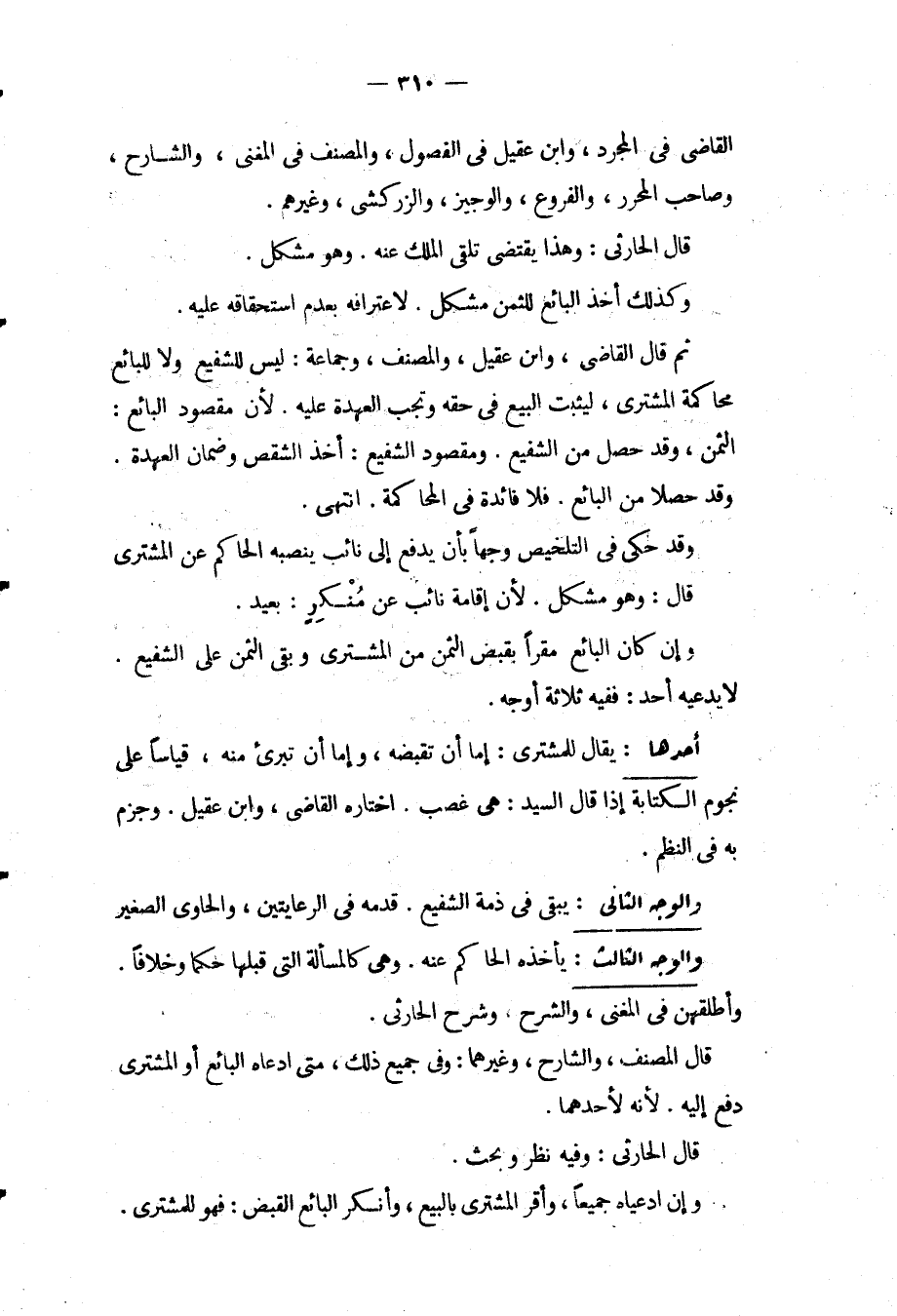 الْقَاضِي فِي الْمُجَرَّدِ، وَابْنُ عَقِيلٍ فِي الْفُصُولِ، وَالْمُصَنِّفُ فِي الْمُغْنِي، وَالشَّارِحُ، وَصَاحِبُ الْمُحَرَّرِ، وَالْفُرُوعِ، وَالْوَجِيزِ، وَالزَّرْكَشِيُّ، وَغَيْرُهُمْ. قَالَ الْحَارِثِيُّ: وَهَذَا يَقْتَضِي تَلَقِّيَ الْمِلْكِ عَنْهُ. وَهُوَ مُشْكِلٌ. وَكَذَلِكَ أَخْذُ الْبَائِعِ لِلثَّمَنِ مُشْكِلٌ. لِاعْتِرَافِهِ بِعَدَمِ اسْتِحْقَاقِهِ عَلَيْهِ. ثُمَّ قَالَ الْقَاضِي، وَابْنُ عَقِيلٍ، وَالْمُصَنِّفُ، وَجَمَاعَةٌ: لَيْسَ لِلشَّفِيعِ وَلَا لِلْبَائِعِ مُحَاكَمَةُ الْمُشْتَرِي، لِيَثْبُتَ الْبَيْعُ فِي حَقِّهِ وَتَجِبُ الْعُهْدَةُ عَلَيْهِ. لِأَنَّ مَقْصُودَ الْبَائِعِ: الثَّمَنُ، وَقَدْ حَصَلَ مِنْ الشَّفِيعِ. وَمَقْصُودُ الشَّفِيعِ: أَخْذُ الشِّقْصِ وَضَمَانُ الْعُهْدَةِ. وَقَدْ حَصَلَا مِنْ الْبَائِعِ. فَلَا فَائِدَةَ فِي الْمُحَاكَمَةِ. انْتَهَى. وَقَدْ حَكَى فِي التَّلْخِيصِ وَجْهًا بِأَنْ يَدْفَعَ إلَى نَائِبٍ يُنَصِّبُهُ الْحَاكِمُ عَنْ الْمُشْتَرِي قَالَ: وَهُوَ مُشْكِلٌ. لِأَنَّ إقَامَةَ نَائِبٍ عَنْ مُنْكِرٍ: بَعِيدٌ. وَإِنْ كَانَ الْبَائِعُ مُقِرًّا بِقَبْضِ الثَّمَنِ مِنْ الْمُشْتَرِي وَبَقِيَ الثَّمَنُ عَلَى الشَّفِيعِ. لَا يَدَّعِيهِ أَحَدٌ: فَفِيهِ ثَلَاثُهُ أَوْجُهٍ.