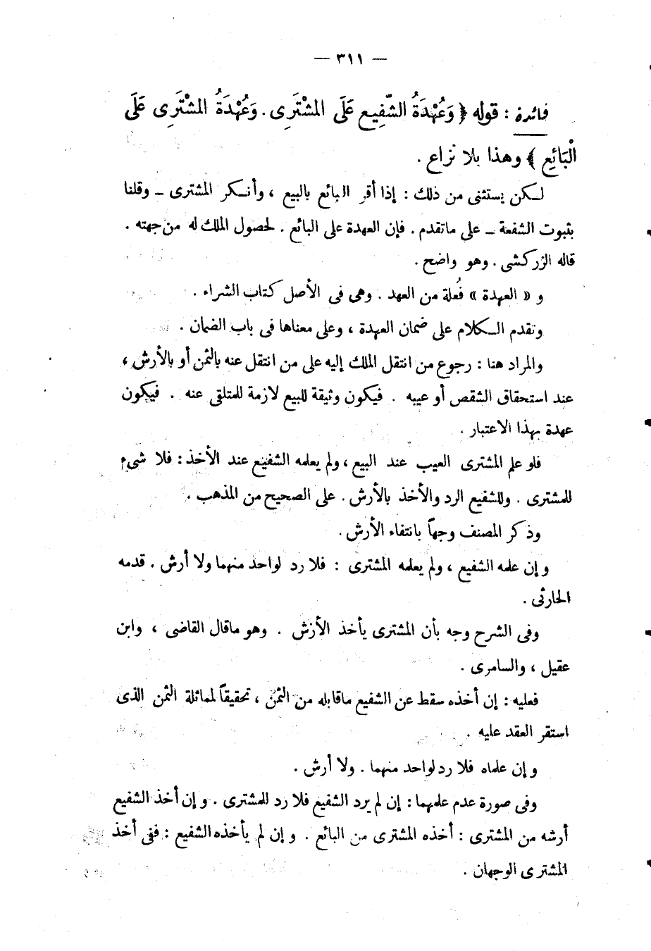 فَائِدَةٌ: قَوْلُهُ (وَعُهْدَةُ الشَّفِيعِ عَلَى الْمُشْتَرِي. وَعُهْدَةُ الْمُشْتَرِي عَلَى الْبَائِعِ) وَهَذَا بِلَا نِزَاعٍ. لَكِنْ يُسْتَثْنَى مِنْ ذَلِكَ: إذَا أَقَرَّ الْبَائِعُ بِالْبَيْعِ، وَأَنْكَرَ الْمُشْتَرِي وَقُلْنَا بِثُبُوتِ الشُّفْعَةِ عَلَى مَا تَقَدَّمَ. فَإِنَّ الْعُهْدَةَ عَلَى الْبَائِعِ. لِحُصُولِ الْمِلْكِ لَهُ مِنْ جِهَتِهِ. قَالَهُ الزَّرْكَشِيُّ. وَهُوَ وَاضِحٌ. وَ " الْعُهْدَةُ " فُعْلَةٌ مِنْ الْعَهْدِ. وَهِيَ فِي الْأَصْلِ كِتَابُ الشِّرَاءِ. وَتَقَدَّمَ الْكَلَامُ عَلَى ضَمَانِ الْعُهْدَةِ، وَعَلَى مَعْنَاهَا فِي بَابِ الضَّمَانِ. وَالْمُرَادُ هُنَا: رُجُوعُ مَنْ انْتَقَلَ الْمِلْكُ إلَيْهِ عَلَى مَنْ انْتَقَلَ عَنْهُ بِالثَّمَنِ أَوْ بِالْأَرْشِ، عِنْدَ اسْتِحْقَاقِ الشِّقْصِ أَوْ عَيْبِهِ. فَيَكُونُ وَثِيقَةً لِلْبَيْعِ لَازِمَةً لِلْمُتَلَقَّى عَنْهُ. فَيَكُونُ عُهْدَةً بِهَذَا الِاعْتِبَارِ. فَلَوْ عَلِمَ الْمُشْتَرِي الْعَيْبَ عِنْدَ الْبَيْعِ، وَلَمْ يَعْلَمْهُ الشَّفِيعُ عِنْدَ الْأَخْذِ: فَلَا شَيْءَ لِلْمُشْتَرِي. وَلِلشَّفِيعِ الرَّدُّ وَالْأَخْذُ بِالْأَرْشِ. عَلَى الصَّحِيحِ مِنْ الْمَذْهَبِ. وَذَكَرَ الْمُصَنِّفُ وَجْهًا بِانْتِفَاءِ الْأَرْشِ. وَإِنْ عَلِمَهُ الشَّفِيعُ، وَلَمْ يَعْلَمْهُ الْمُشْتَرِي: فَلَا رَدَّ لِوَاحِدٍ مِنْهُمَا وَلَا أَرْشَ. قَدَّمَهُ الْحَارِثِيُّ. وَفِي الشَّرْحِ وَجْهٌ بِأَنَّ الْمُشْتَرِيَ يَأْخُذُ الْأَرْشَ. وَهُوَ مَا قَالَ الْقَاضِي، وَابْنُ عَقِيلٍ، وَالسَّامِرِيُّ. فَعَلَيْهِ: إنْ أَخَذَهُ سَقَطَ عَنْ الشَّفِيعِ مَا قَابَلَهُ مِنْ الثَّمَنِ، تَحْقِيقًا لِمُمَاثَلَةِ الثَّمَنِ الَّذِي اسْتَقَرَّ الْعَقْدُ عَلَيْهِ. وَإِنْ عَلِمَاهُ فَلَا رَدَّ لِوَاحِدٍ مِنْهُمَا. وَلَا أَرْشَ. وَفِي صُورَةِ عَدَمِ عِلْمِهِمَا: إنْ لَمْ يَرُدَّ الشَّفِيعُ فَلَا رَدَّ لِلْمُشْتَرِي. وَإِنْ أَخَذَ الشَّفِيعُ أَرْشَهُ مِنْ الْمُشْتَرِي: أَخَذَ الْمُشْتَرِي مِنْ الْبَائِعِ. وَإِنْ لَمْ يَأْخُذْهُ الشَّفِيعُ: فَفِي أَخْذِ الْمُشْتَرِي الْوَجْهَانِ.