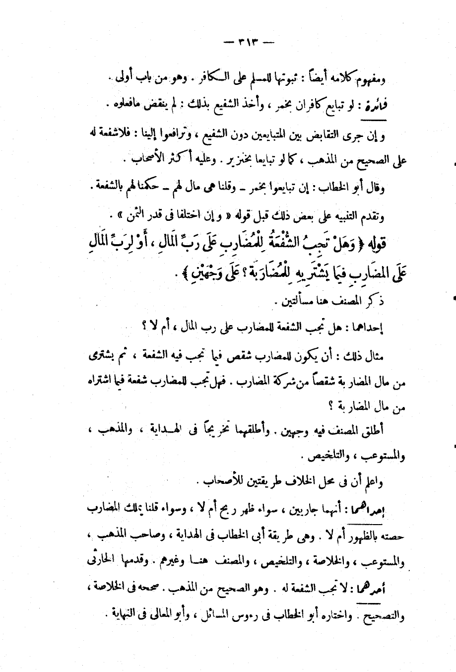 إحْدَاهُمَا: هَلْ تَجِبُ الشُّفْعَةُ لِلْمُضَارِبِ عَلَى رَبِّ الْمَالِ، أَمْ لَا؟ مِثَالُ ذَلِكَ: أَنْ يَكُونَ لِلْمُضَارِبِ شِقْصٌ فِيمَا تَجِبُ فِيهِ الشُّفْعَةُ، ثُمَّ يَشْتَرِي مِنْ مَالِ الْمُضَارَبَةِ شِقْصًا مِنْ شَرِكَةِ الْمُضَارِبِ. فَهَلْ تَجِبُ لِلْمُضَارِبِ شُفْعَةٌ فِيمَا اشْتَرَاهُ مِنْ مَالِ الْمُضَارَبَةِ؟ أَطْلَقَ الْمُصَنِّفُ فِيهِ وَجْهَيْنِ. وَأَطْلَقَهُمَا تَخْرِيجًا فِي الْهِدَايَةِ، وَالْمُذْهَبِ، وَالْمُسْتَوْعِبِ، وَالتَّلْخِيصِ. وَاعْلَمْ أَنَّ فِي مَحَلِّ الْخِلَافِ طَرِيقَتَيْنِ لِلْأَصْحَابِ.