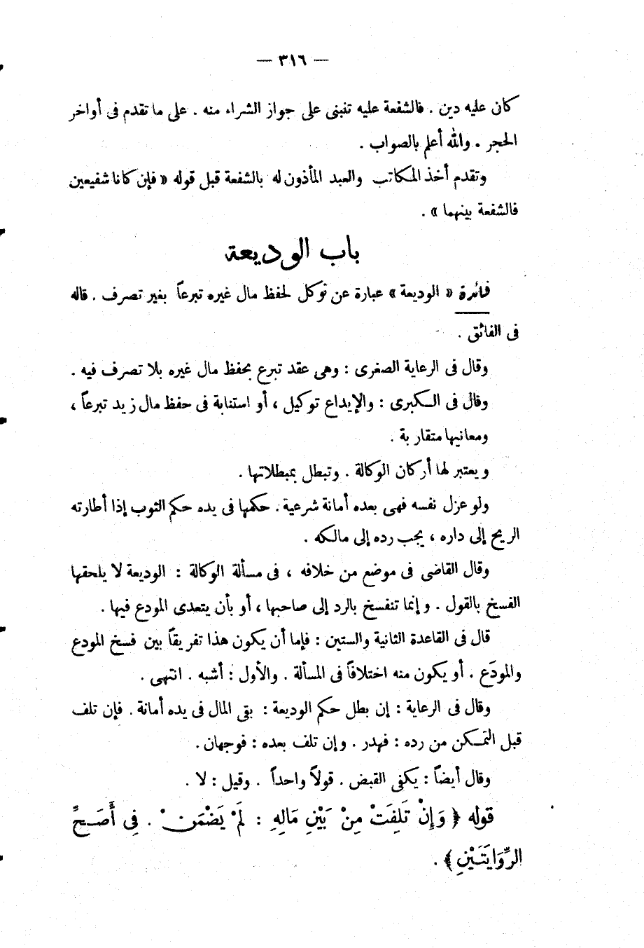 ِ فَائِدَةٌ الْوَدِيعَةُ عِبَارَةٌ عَنْ تَوَكُّلٍ لِحِفْظِ مَالِ غَيْرِهِ تَبَرُّعًا بِغَيْرِ تَصَرُّفٍ. قَالَهُ فِي الْفَائِقِ. وَقَالَ فِي الرِّعَايَةِ الصُّغْرَى: وَهِيَ عَقْدُ تَبَرُّعٍ بِحِفْظِ مَالِ غَيْرِهِ بِلَا تَصَرُّفٍ فِيهِ. وَقَالَ فِي الْكُبْرَى: وَالْإِيدَاعُ تَوْكِيلٌ، أَوْ اسْتِنَابَةٌ فِي حِفْظِ مَالِ زَيْدٍ تَبَرُّعًا، وَمَعَانِيهَا مُتَقَارِبَةٌ. وَيُعْتَبَرُ لَهَا أَرْكَانُ الْوِكَالَةِ. وَتَبْطُلُ بِمُبْطِلَاتِهَا. وَلَوْ عَزَلَ نَفْسَهُ فَهِيَ بَعْدَهُ أَمَانَةٌ شَرْعِيَّةٌ. حُكْمُهَا فِي يَدِهِ حُكْمُ الثَّوْبِ إذَا أَطَارَتْهُ الرِّيحُ إلَى دَارِهِ، يَجِبُ رَدُّهُ إلَى مَالِكِهِ. وَقَالَ الْقَاضِي فِي مَوْضِعٍ مِنْ خِلَافِهِ، فِي مَسْأَلَةِ الْوِكَالَةِ: الْوَدِيعَةُ لَا يَلْحَقُهَا الْفَسْخُ بِالْقَوْلِ. وَإِنَّمَا تَنْفَسِخُ بِالرَّدِّ إلَى صَاحِبِهَا، أَوْ بِأَنْ يَتَعَدَّى الْمُودِعُ فِيهَا. قَالَ فِي الْقَاعِدَةِ الثَّانِيَةِ وَالسِّتِّينَ: فَإِمَّا أَنْ يَكُونَ هَذَا تَفْرِيقًا بَيْنَ فَسْخِ الْمُودِعِ وَالْمُودَعِ. أَوْ يَكُونَ مِنْهُ اخْتِلَافًا فِي الْمَسْأَلَةِ. وَالْأَوَّلُ: أَشْبَهُ. انْتَهَى. وَقَالَ فِي الرِّعَايَةِ: إنْ بَطَلَ حُكْمُ الْوَدِيعَةِ: بَقِيَ الْمَالُ فِي يَدِهِ أَمَانَةً. فَإِنْ تَلِفَ قَبْلَ التَّمَكُّنِ مِنْ رَدِّهِ: فَهَدَرٌ. وَإِنْ تَلِفَ بَعْدَهُ: فَوَجْهَانِ. وَقَالَ أَيْضًا: يَكْفِي الْقَبْضُ. قَوْلًا وَاحِدًا. وَقِيلَ: لَا. قَوْلُهُ (وَإِنْ تَلِفَ مِنْ بَيْنِ مَالِهِ: لَمْ يَضْمَنْ. فِي أَصَحِّ الرِّوَايَتَيْنِ) .