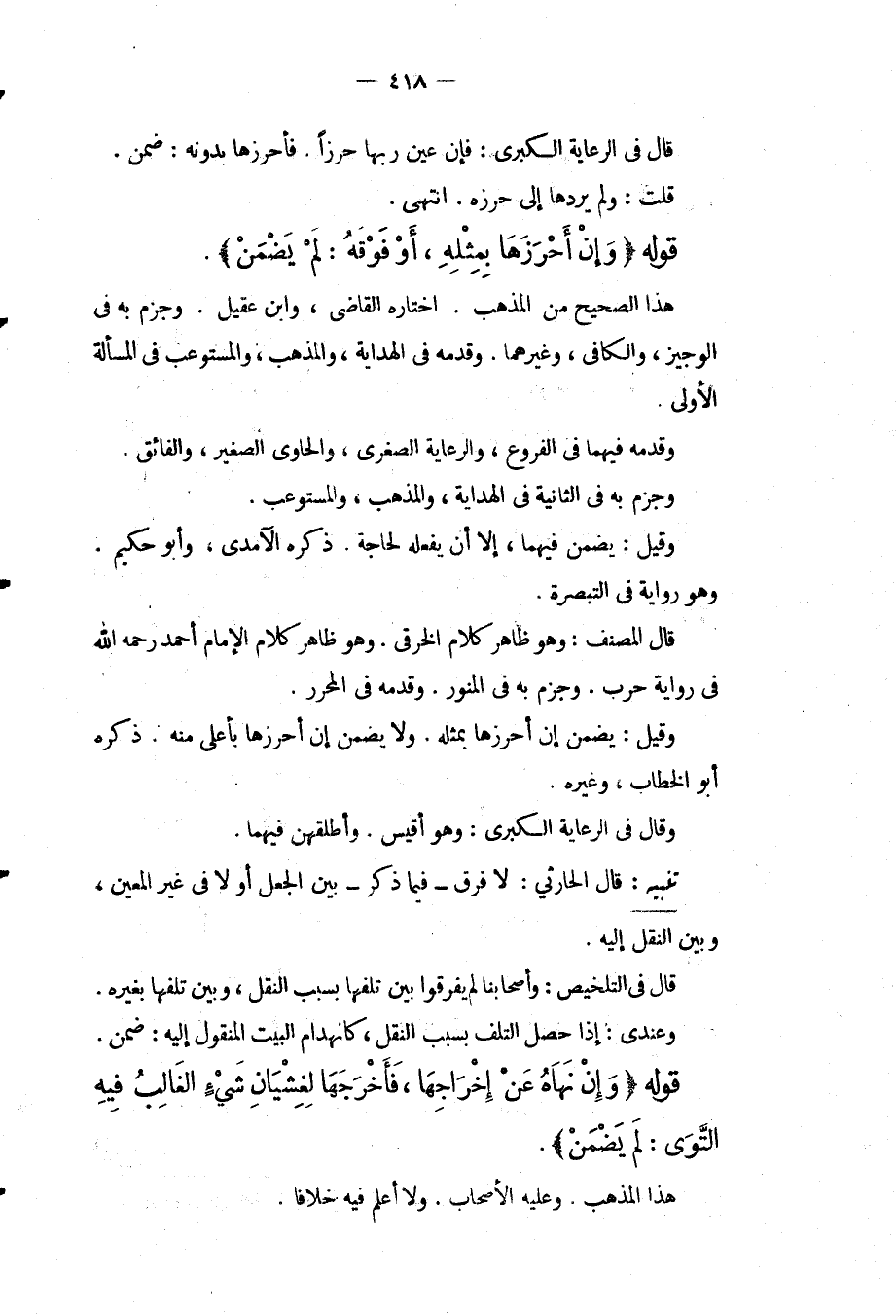 قَالَ فِي الرِّعَايَةِ الْكُبْرَى: فَإِنْ عَيَّنَ رَبُّهَا حِرْزًا. فَأَحْرَزَهَا بِدُونِهِ: ضَمِنَ. قُلْت: وَلَمْ يَرُدَّهَا إلَى حِرْزِهِ. انْتَهَى. قَوْلُهُ (وَإِنْ أَحْرَزَهَا بِمِثْلِهِ، أَوْ فَوْقَهُ: لَمْ يَضْمَنُ) . هَذَا الصَّحِيحُ مِنْ الْمَذْهَبِ. اخْتَارَهُ الْقَاضِي، وَابْنُ عَقِيلٍ. وَجَزَمَ بِهِ فِي الْوَجِيزِ، وَالْكَافِي، وَغَيْرِهِمَا. وَقَدَّمَهُ فِي الْهِدَايَةِ، وَالْمُذْهَبِ، وَالْمُسْتَوْعِبِ فِي الْمَسْأَلَةِ الْأُولَى. وَقَدَّمَهُ فِيهِمَا فِي الْفُرُوعِ، وَالرِّعَايَةِ الصُّغْرَى، وَالْحَاوِي الصَّغِيرِ، وَالْفَائِقِ. وَجَزَمَ بِهِ فِي الثَّانِيَةِ فِي الْهِدَايَةِ، وَالْمُذْهَبِ. وَالْمُسْتَوْعِبِ. وَقِيلَ: يَضْمَنُ فِيهِمَا، إلَّا أَنْ يَفْعَلَهُ لِحَاجَةٍ. ذَكَرَهُ الْآمِدِيُّ، وَأَبُو حَكِيمٍ. وَهُوَ رِوَايَةٌ فِي التَّبْصِرَةِ. قَالَ الْمُصَنِّفُ: وَهُوَ ظَاهِرُ كَلَامِ الْخِرَقِيِّ. وَهُوَ ظَاهِرُ كَلَامِ الْإِمَامِ أَحْمَدَ - رَحِمَهُ اللَّهُ - فِي رِوَايَةِ حَرْبٍ. وَجَزَمَ بِهِ فِي الْمُنَوِّرِ. وَقَدَّمَهُ فِي الْمُحَرَّرِ. وَقِيلَ: يَضْمَنُ إنْ أَحْرَزَهَا بِمِثْلِهِ. وَلَا يَضْمَنُ إنْ أَحْرَزَهَا بِأَعْلَى مِنْهُ. ذَكَرَهُ أَبُو الْخَطَّابِ، وَغَيْرُهُ. وَقَالَ فِي الرِّعَايَةِ الْكُبْرَى: وَهُوَ أَقْيَسُ. وَأَطْلَقَهُنَّ فِيهِمَا.