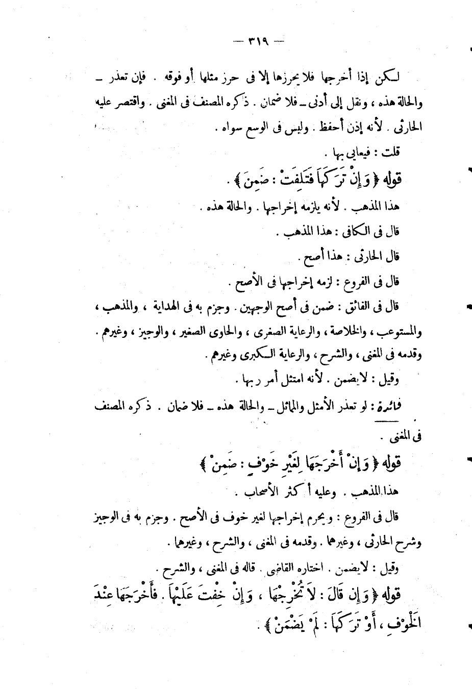 لَكِنْ إذَا أَخْرَجَهَا فَلَا يُحْرِزُهَا إلَّا فِي حِرْزٍ مِثْلِهَا أَوْ فَوْقَهُ. فَإِنْ تَعَذَّرَ وَالْحَالَةُ هَذِهِ، وَنَقَلَ إلَى أَدْنَى فَلَا ضَمَانَ. ذَكَرَهُ الْمُصَنِّفُ فِي الْمُغْنِي. وَاقْتَصَرَ عَلَيْهِ الْحَارِثِيُّ. لِأَنَّهُ إذَنْ أَحْفَظُ. وَلَيْسَ فِي الْوُسْعِ سِوَاهُ. قُلْت: فَيُعَايَى بِهَا. قَوْلُهُ (وَإِنْ تَرَكَهَا فَتَلِفَتْ: ضَمِنَ) . هَذَا الْمَذْهَبُ. لِأَنَّهُ يَلْزَمُهُ إخْرَاجُهَا. وَالْحَالَةُ هَذِهِ. قَالَ فِي الْكَافِي: هَذَا الْمَذْهَبُ. قَالَ الْحَارِثِيُّ: هَذَا أَصَحُّ. قَالَ فِي الْفُرُوعِ: لَزِمَهُ إخْرَاجُهَا فِي الْأَصَحِّ. قَالَ فِي الْفَائِقِ: ضَمِنَ فِي أَصَحِّ الْوَجْهَيْنِ. وَجَزَمَ بِهِ فِي الْهِدَايَةِ، وَالْمُذْهَبِ، وَالْمُسْتَوْعِبِ، وَالْخُلَاصَةِ، وَالرِّعَايَةِ الصُّغْرَى، وَالْحَاوِي الصَّغِيرِ، وَالْوَجِيزِ، وَغَيْرِهِمْ.