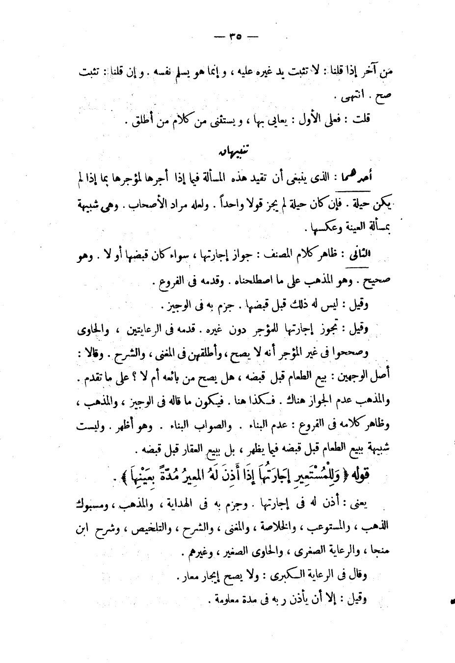 الثَّانِي: ظَاهِرُ كَلَامِ الْمُصَنِّفِ: جَوَازُ إجَارَتِهَا، سَوَاءٌ كَانَ قَبَضَهَا أَوْ لَا. وَهُوَ صَحِيحٌ. وَهُوَ الْمَذْهَبُ عَلَى مَا اصْطَلَحْنَاهُ. وَقَدَّمَهُ فِي الْفُرُوعِ. وَقِيلَ: لَيْسَ لَهُ ذَلِكَ قَبْلَ قَبْضِهَا. جَزَمَ بِهِ فِي الْوَجِيزِ. وَقِيلَ: تَجُوزُ إجَارَتُهَا لِلْمُؤَجِّرِ دُونَ غَيْرِهِ. قَدَّمَهُ فِي الرِّعَايَتَيْنِ، وَالْحَاوِي وَصَحَّحُوا فِي غَيْرِ الْمُؤَجِّرِ أَنَّهُ لَا يَصِحُّ، وَأَطْلَقَهُنَّ فِي الْمُغْنِي، وَالشَّرْحِ. وَقَالَا: أَصْلُ الْوَجْهَيْنِ: بَيْعُ الطَّعَامِ قَبْلَ قَبْضِهِ، هَلْ يَصِحُّ مِنْ بَائِعِهِ أَمْ لَا؟ عَلَى مَا تَقَدَّمَ. وَالْمَذْهَبُ عَدَمُ الْجَوَازِ هُنَاكَ. فَكَذَا هُنَا. فَيَكُونُ مَا قَالَهُ فِي الْوَجِيزِ، وَالْمُذْهَبِ، وَظَاهِرُ كَلَامِهِ فِي الْفُرُوعِ: عَدَمُ الْبِنَاءِ. وَالصَّوَابُ الْبِنَاءُ. وَهُوَ أَظْهَرُ. وَلَيْسَتْ شَبِيهَةً بِبَيْعِ الطَّعَامِ قَبْلَ قَبْضِهِ فِيمَا يَظْهَرُ، بَلْ بِبَيْعِ الْعَقَارِ قَبْلَ قَبْضِهِ. .