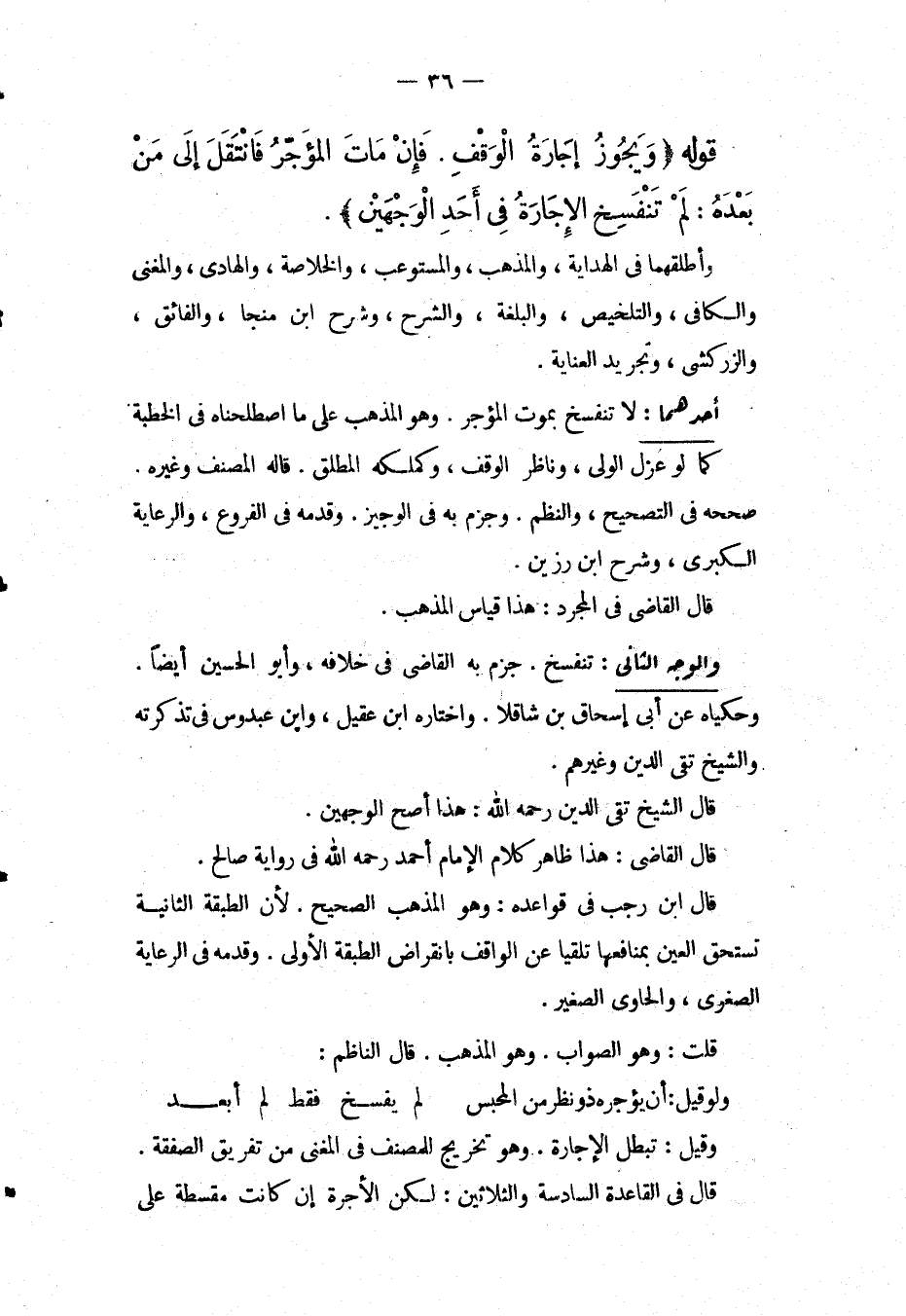 قَوْلُهُ (وَيَجُوزُ إجَارَةُ الْوَقْفِ. فَإِنْ مَاتَ الْمُؤَجِّرُ فَانْتَقَلَ إلَى مَنْ بَعْدَهُ: لَمْ تَنْفَسِخْ الْإِجَارَةُ فِي أَحَدِ الْوَجْهَيْنِ) . وَأَطْلَقَهُمَا فِي الْهِدَايَةِ، وَالْمُذْهَبِ، وَالْمُسْتَوْعِبِ، وَالْخُلَاصَةِ، وَالْهَادِي، وَالْمُغْنِي وَالْكَافِي، وَالتَّلْخِيصِ، وَالْبُلْغَةِ، وَالشَّرْحِ، وَشَرْحِ ابْنِ مُنَجَّا، وَالْفَائِقِ، وَالزَّرْكَشِيِّ، وَتَجْرِيدِ الْعِنَايَةِ. أَحَدُهُمَا: لَا تَنْفَسِخُ بِمَوْتِ الْمُؤَجِّرِ. وَهُوَ الْمَذْهَبُ عَلَى مَا اصْطَلَحْنَاهُ فِي الْخُطْبَةِ كَمَا لَوْ عُزِلَ الْوَلِيُّ، وَنَاظِرُ الْوَقْفِ، وَكَمِلْكِهِ الْمُطْلَقِ. قَالَهُ الْمُصَنِّفُ وَغَيْرُهُ. صَحَّحَهُ فِي التَّصْحِيحِ، وَالنَّظْمِ. وَجَزَمَ بِهِ فِي الْوَجِيزِ. وَقَدَّمَهُ فِي الْفُرُوعِ، وَالرِّعَايَةِ الْكُبْرَى، وَشَرْحِ ابْنِ رَزِينٍ. قَالَ الْقَاضِي فِي الْمُجَرَّدِ: هَذَا قِيَاسُ الْمَذْهَبِ.