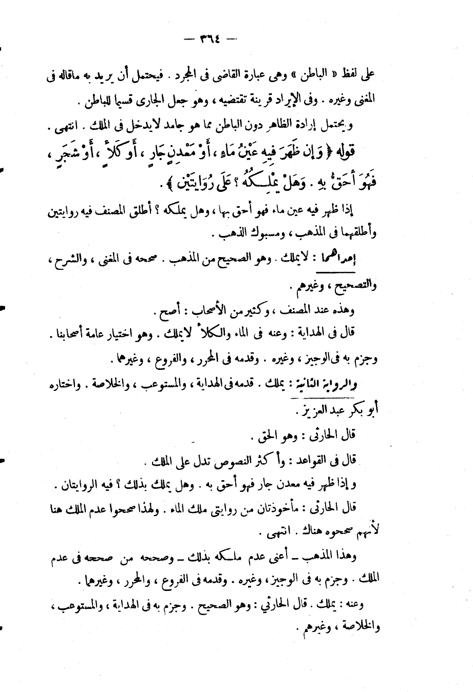 وَالرِّوَايَةُ الثَّانِيَةُ: يَمْلِكُ. قَدَّمَهُ فِي الْهِدَايَةِ، وَالْمُسْتَوْعِبِ، وَالْخُلَاصَةِ. وَاخْتَارَهُ أَبُو بَكْرٍ عَبْدُ الْعَزِيزِ. قَالَ الْحَارِثِيُّ: وَهُوَ الْحَقُّ. قَالَ فِي الْقَوَاعِدِ: وَأَكْثَرُ النُّصُوصِ تَدُلُّ عَلَى الْمِلْكِ وَإِذَا ظَهَرَ فِيهِ مَعْدِنٌ جَارٍ فَهُوَ أَحَقُّ بِهِ. وَهَلْ يَمْلِكُ بِذَلِكَ؟ فِيهِ الرِّوَايَتَانِ. قَالَ الْحَارِثِيُّ: مَأْخُوذَتَانِ مِنْ رِوَايَتَيْ مِلْكِ الْمَاءِ. وَلِهَذَا صَحَّحُوا عَدَمَ الْمِلْكِ هُنَا لِأَنَّهُمْ صَحَّحُوهُ هُنَاكَ. انْتَهَى. وَهَذَا الْمَذْهَبُ أَعْنِي عَدَمَ مِلْكِهِ بِذَلِكَ وَصَحَّحَهُ مَنْ صَحَّحَهُ فِي عَدَمِ الْمِلْكِ. وَجَزَمَ بِهِ فِي الْوَجِيزِ، وَغَيْرِهِ. وَقَدَّمَهُ فِي الْفُرُوعِ، وَالْمُحَرَّرِ، وَغَيْرِهِمَا. وَعَنْهُ: يَمْلِكُ. قَالَ الْحَارِثِيُّ: وَهُوَ الصَّحِيحُ. وَجَزَمَ بِهِ فِي الْهِدَايَةِ، وَالْمُسْتَوْعِبِ، وَالْخُلَاصَةِ، وَغَيْرِهِمْ.