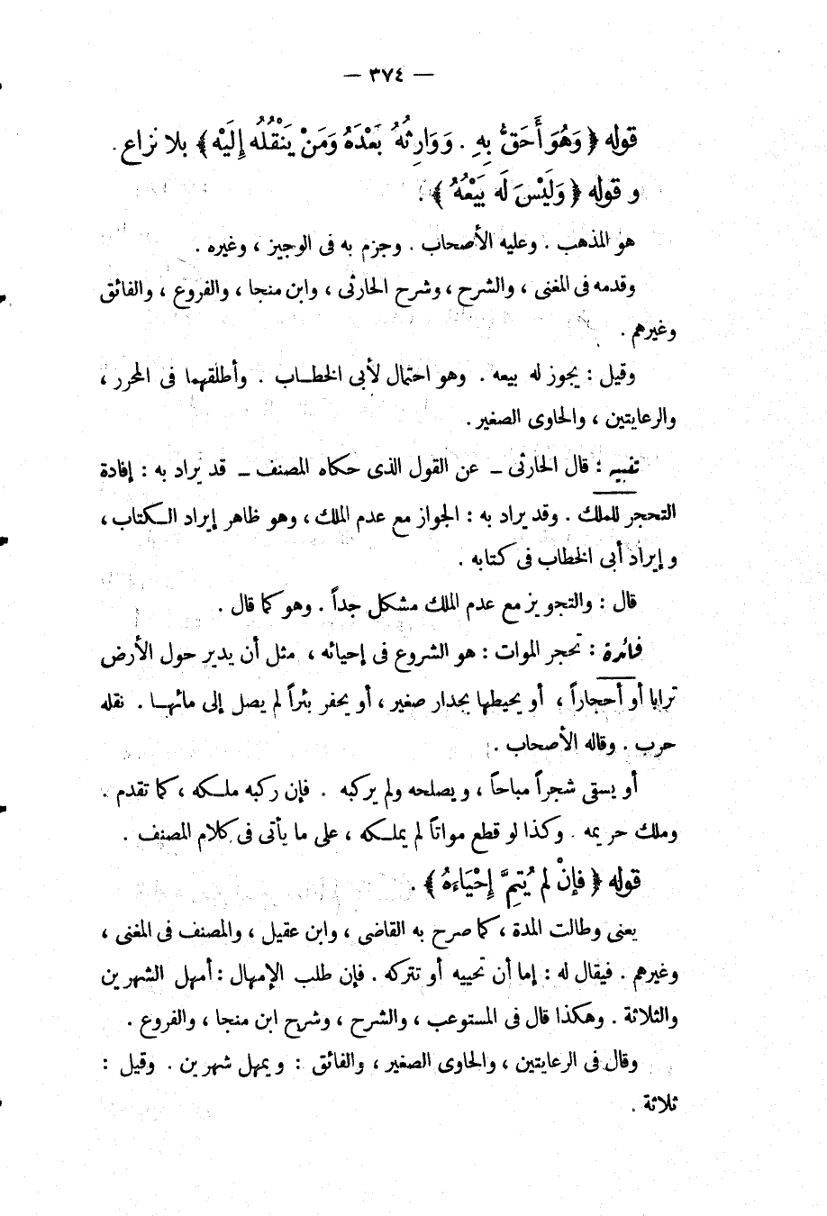 تَنْبِيهٌ: قَالَ الْحَارِثِيُّ عَنْ الْقَوْلِ الَّذِي حَكَاهُ الْمُصَنِّفُ قَدْ يُرَادُ بِهِ: إفَادَةُ التَّحَجُّرِ لِلْمِلْكِ. وَقَدْ يُرَادُ بِهِ: الْجَوَازُ مَعَ عَدَمِ الْمِلْكِ، وَهُوَ ظَاهِرُ إيرَادِ الْكِتَابِ، وَإِيرَادِ أَبِي الْخَطَّابِ فِي كِتَابِهِ. قَالَ: وَالتَّجْوِيزُ مَعَ عَدَمِ الْمِلْكِ مُشْكِلٌ جِدًّا. وَهُوَ كَمَا قَالَ.