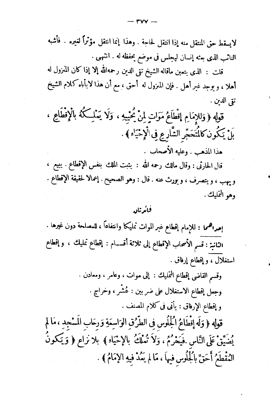الثَّانِيَةُ: قَسَّمَ الْأَصْحَابُ الْإِقْطَاعَ إلَى ثَلَاثَةِ أَقْسَامٍ: إقْطَاعُ تَمْلِيكٍ، وَإِقْطَاعُ اسْتِغْلَالٍ، وَإِقْطَاعُ إرْفَاقٍ. وَقَسَمَ الْقَاضِي إقْطَاعَ التَّمْلِيكِ: إلَى مَوَاتٍ، وَعَامِرٍ، وَمَعَادِنَ. وَجَعَلَ إقْطَاعَ الِاسْتِغْلَالِ عَلَى ضَرْبَيْنِ: عُشْرٌ، وَخَرَاجٌ. وَإِقْطَاعُ الْإِرْفَاقِ: يَأْتِي فِي كَلَامِ الْمُصَنِّفِ.