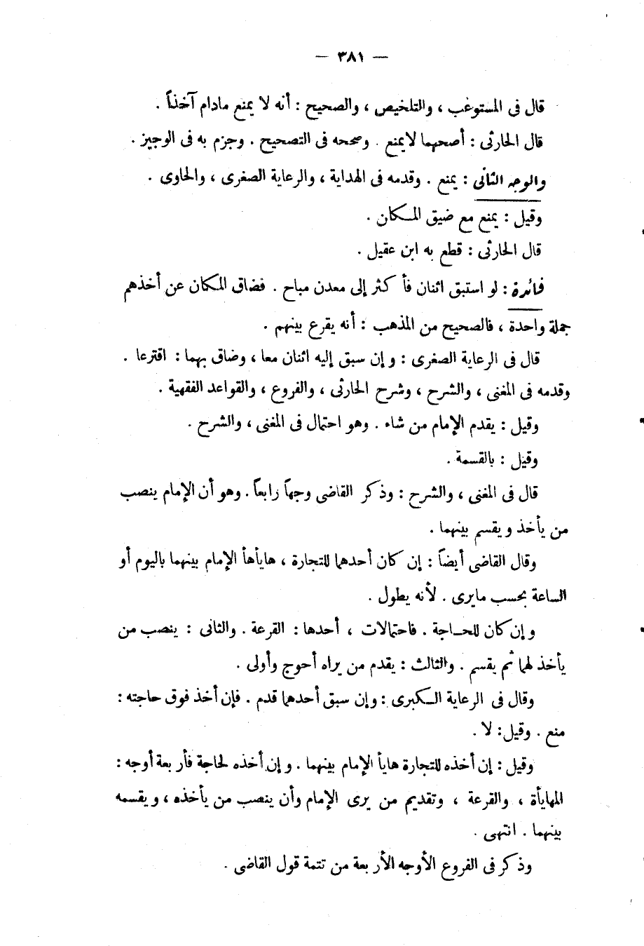وَالثَّالِثُ: يُقَدِّمُ مَنْ يَرَاهُ أَحْوَجَ وَأَوْلَى. وَقَالَ فِي الرِّعَايَةِ الْكُبْرَى: وَإِنْ سَبَقَ أَحَدُهُمَا قُدِّمَ. فَإِنْ أَخَذَ فَوْقَ حَاجَتِهِ: مُنِعَ. وَقِيلَ: لَا. وَقِيلَ: إنْ أَخَذَهُ لِلتِّجَارَةِ هَايَأَ الْإِمَامُ بَيْنَهُمَا. وَإِنْ أَخَذَهُ لِحَاجَةٍ فَأَرْبَعَةُ أَوْجُهٍ: الْمُهَايَأَةُ، وَالْقُرْعَةُ، وَتَقْدِيمُ مَنْ يَرَى الْإِمَامُ وَأَنْ يُنَصِّبَ مَنْ يَأْخُذُهُ، وَيَقْسِمَهُ بَيْنَهُمَا. انْتَهَى. وَذُكِرَ فِي الْفُرُوعِ الْأَوْجُهُ الْأَرْبَعَةُ مِنْ تَتِمَّةِ قَوْلِ الْقَاضِي.