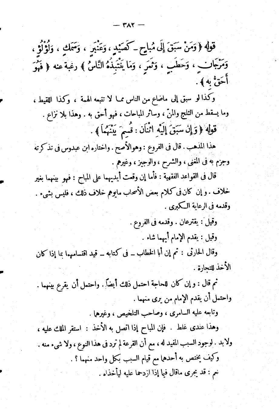 قَوْلُهُ (وَمَنْ سَبَقَ إلَى مُبَاحٍ كَصَيْدٍ، وَعَنْبَرٍ، وَسَمَكٍ، وَلُؤْلُؤٍ، وَمِرْجَانٍ، وَحَطَبٍ، وَثَمَرٍ، وَمَا يَنْتَبِذُهُ النَّاسُ) رَغْبَةً عَنْهُ (فَهُوَ أَحَقُّ بِهِ) . وَكَذَا لَوْ سَبَقَ إلَى مَا ضَاعَ مِنْ النَّاسِ مِمَّا لَا تَتْبَعُهُ الْهِمَّةُ، وَكَذَا اللَّقِيطُ، وَمَا يَسْقُطُ مِنْ الثَّلْجِ وَالْمَنِّ، وَسَائِرِ الْمُبَاحَاتِ، فَهُوَ أَحَقُّ بِهِ. وَهَذَا بِلَا نِزَاعٍ. قَوْلُهُ (وَإِنْ سَبَقَ إلَيْهِ اثْنَانِ: قُسِمَ بَيْنَهُمَا) . هَذَا الْمَذْهَبُ. قَالَ فِي الْفُرُوعِ: وَهُوَ الْأَصَحُّ. وَاخْتَارَهُ ابْنُ عَبْدُوسٍ فِي تَذْكِرَتِهِ وَجُزِمَ بِهِ فِي الْمُغْنِي، وَالشَّرْحِ، وَالْوَجِيزِ، وَغَيْرِهِمْ. قَالَ فِي الْقَوَاعِدِ الْفِقْهِيَّةِ: فَأَمَّا إنْ وَقَعَتْ أَيْدِيهِمَا عَلَى الْمُبَاحِ: فَهُوَ بَيْنَهُمَا بِغَيْرِ خِلَافٍ. وَإِنْ كَانَ فِي كَلَامِ بَعْضِ الْأَصْحَابِ مَا يُوهِمُ خِلَافَ ذَلِكَ، فَلَيْسَ بِشَيْءٍ. وَقَدَّمَهُ فِي الرِّعَايَةِ الْكُبْرَى. وَقِيلَ: يَقْتَرِعَانِ. وَقَدَّمَهُ فِي الْفُرُوعِ. وَقِيلَ: يُقَدِّمُ الْإِمَامُ أَيَّهُمَا شَاءَ. وَقَالَ الْحَارِثِيُّ: ثُمَّ إنَّ أَبَا الْخَطَّابِ فِي كِتَابِهِ قَيَّدَ اقْتِسَامَهُمَا بِمَا إذَا كَانَ الْأَخْذُ لِلتِّجَارَةِ. ثُمَّ قَالَ: وَإِنْ كَانَ لِلْحَاجَةِ اُحْتُمِلَ ذَلِكَ أَيْضًا. وَاحْتُمِلَ أَنْ يُقْرَعَ بَيْنَهُمَا. وَاحْتُمِلَ أَنْ يُقَدِّمَ الْإِمَامُ مَنْ يَرَى مِنْهُمَا. وَتَابَعَهُ عَلَيْهِ السَّامِرِيُّ، وَصَاحِبُ التَّلْخِيصِ، وَغَيْرُهُمَا. وَهَذَا عِنْدِي غَلَطٌ. فَإِنَّ الْمُبَاحَ إذَا اتَّصَلَ بِهِ الْآخِذُ: اسْتَقَرَّ الْمِلْكُ عَلَيْهِ، وَلَا بُدَّ. لِوُجُودِ السَّبَبِ الْمُفِيدِ لَهُ، مَعَ أَنَّ الْقُرْعَةَ لَمْ تَرِدْ فِي هَذَا النَّوْعِ، وَلَا شَيْءٍ مِنْهُ. وَكَيْفَ يَخْتَصُّ بِهِ أَحَدُهُمَا مَعَ قِيَامِ السَّبَبِ بِكُلِّ وَاحِدٍ مِنْهُمَا؟ نَعَمْ: قَدْ يَجْرِي مَا قَالَ فِيمَا إذَا ازْدَحَمَا عَلَيْهِ لِيَأْخُذَاهُ.