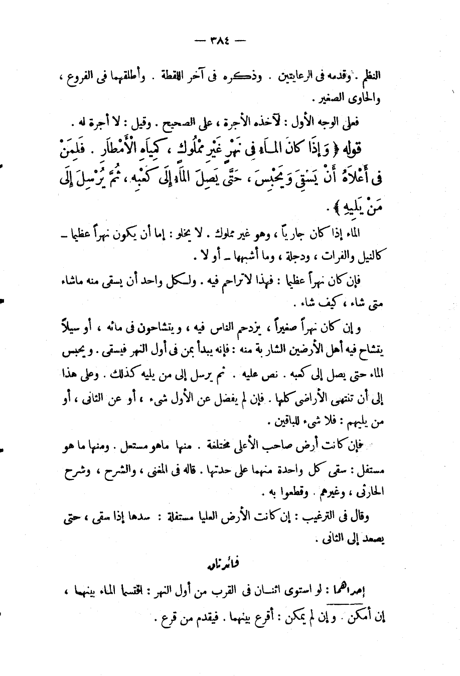قَوْلُهُ (وَإِذَا كَانَ الْمَاءُ فِي نَهْرٍ غَيْرِ مَمْلُوكٍ، كَمِيَاهِ الْأَمْطَارِ. فَلِمَنْ فِي أَعْلَاهُ أَنْ يَسْقِيَ وَيَحْبِسَ، حَتَّى يَصِلَ الْمَاءُ إلَى كَعْبِهِ، ثُمَّ يُرْسِلَ إلَى مَنْ يَلِيهِ) . الْمَاءُ إذَا كَانَ جَارِيًا، وَهُوَ غَيْرُ مَمْلُوكٍ. لَا يَخْلُو: إمَّا أَنْ يَكُونَ نَهْرًا عَظِيمًا كَالنِّيلِ وَالْفُرَاتِ، وَدِجْلَةَ، وَمَا أَشْبَهَهَا أَوْ لَا. فَإِنْ كَانَ نَهْرًا عَظِيمًا: فَهَذَا لَا تَرَاحُمَ فِيهِ. وَلِكُلِّ وَاحِدٍ أَنْ يَسْقِيَ مِنْهُ مَا شَاءَ مَتَى شَاءَ، كَيْفَ شَاءَ. وَإِنْ كَانَ نَهْرًا صَغِيرًا، يَزْدَحِمُ النَّاسُ فِيهِ، وَيَتَشَاحُّونَ فِي مَائِهِ، أَوْ سَيْلًا يَتَشَاحُّ فِيهِ أَهْلُ الْأَرْضِينَ الشَّارِبَةِ مِنْهُ: فَإِنَّهُ يُبْدَأُ بِمَنْ فِي أَوَّلِ النَّهْرِ فَيَسْقِي. وَيَحْبِسُ الْمَاءَ حَتَّى يَصِلَ إلَى كَعْبِهِ. نَصَّ عَلَيْهِ. ثُمَّ يُرْسِلُ إلَى مَنْ يَلِيهِ كَذَلِكَ. وَعَلَى هَذَا إلَى أَنْ تَنْتَهِيَ الْأَرَاضِي كُلُّهَا. فَإِنْ لَمْ يَفْضُلْ عَنْ الْأَوَّلِ شَيْءٌ، أَوْ عَنْ الثَّانِي، أَوْ مَنْ يَلِيهِمْ: فَلَا شَيْءَ لِلْبَاقِينَ. فَإِنْ كَانَتْ أَرْضُ صَاحِبِ الْأَعْلَى مُخْتَلِفَةً. مِنْهَا مَا هُوَ مُسْتَعْلٍ. وَمِنْهَا مَا هُوَ مُسْتَفْلٌ: سَقَى كُلَّ وَاحِدَةٍ مِنْهُمَا عَلَى حِدَتِهَا. قَالَهُ فِي الْمُغْنِي، وَالشَّرْحِ، وَشَرْحِ الْحَارِثِيِّ، وَغَيْرِهِمْ. وَقَطَعُوا بِهِ. وَقَالَ فِي التَّرْغِيبِ: إنْ كَانَتْ الْأَرْضُ الْعُلْيَا مُسْتَفِلَةً: سَدَّهَا إذَا سَقَى، حَتَّى يَصْعَدَ إلَى الثَّانِي