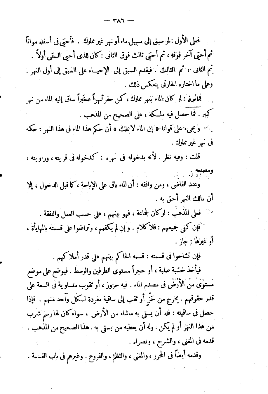 فَائِدَةٌ: لَوْ كَانَ الْمَاءُ بِنَهْرٍ مَمْلُوكٍ، كَمَنْ حَفَرَ نَهْرًا صَغِيرًا سَاقَ إلَيْهِ الْمَاءَ مِنْ نَهْرٍ كَبِيرٍ. فَمَا حَصَلَ فِيهِ مِلْكُهُ، عَلَى الصَّحِيحِ مِنْ الْمَذْهَبِ. وَيَجِيءُ عَلَى قَوْلِنَا " إنَّ الْمَاءَ لَا يُمْلَكُ " أَنَّ حُكْمَ هَذَا الْمَاءِ فِي هَذَا النَّهْرِ: حُكْمُهُ فِي نَهْرٍ غَيْرِ مَمْلُوكٍ. قُلْت: وَفِيهِ نَظَرٌ. لِأَنَّهُ بِدُخُولِهِ فِي نَهْرِهِ: كَدُخُولِهِ فِي قِرْبَتِهِ، وَرَاوِيَتِهِ، وَمَصْنَعِهِ. وَعِنْدَ الْقَاضِي، وَمَنْ وَافَقَهُ: أَنَّ الْمَاءَ بَاقٍ عَلَى الْإِبَاحَةِ، كَمَا قَبْلَ الدُّخُولِ، إلَّا أَنَّ مَالِكَ النَّهْرِ أَحَقُّ بِهِ. فَعَلَى الْمَذْهَبِ: لَوْ كَانَ لِجَمَاعَةٍ، فَهُوَ بَيْنَهُمْ، عَلَى حَسَبِ الْعَمَلِ وَالنَّفَقَةِ. فَإِنْ كَفَى جَمِيعَهُمْ: فَلَا كَلَامَ. وَإِنْ لَمْ يَكْفِهِمْ، وَتَرَاضَوْا عَلَى قِسْمَتِهِ بِالْمُهَايَأَةِ، أَوْ غَيْرِهَا: جَازَ. فَإِنْ تَشَاحُّوا فِي قِسْمَتِهِ: قَسَمَهُ الْحَاكِمُ بَيْنَهُمْ عَلَى قَدْرِ أَمْلَاكِهِمْ. فَيَأْخُذُ خَشَبَةً صُلْبَةً، أَوْ حَجَرًا مُسْتَوِيَ الطَّرَفَيْنِ وَالْوَسَطِ. فَيُوضَعُ عَلَى مَوْضِعٍ مُسْتَوٍ مِنْ الْأَرْضِ فِي مَصِّ دَمِ الْمَاءِ. فِيهِ حُزُوزٌ، أَوْ ثُقُوبٌ مُتَسَاوِيَةٌ فِي السَّعَةِ عَلَى قَدْرِ حُقُوقِهِمْ. يَخْرُجُ مِنْ حَزٍّ أَوْ ثَقْبٍ إلَى سَاقِيَّةٍ مُفْرَدَةٍ لِكُلِّ وَاحِدٍ مِنْهُمْ. فَإِذَا حَصَلَ فِي سَاقِيَّتِهِ: فَلَهُ أَنْ يَسْقِيَ بِهِ مَا شَاءَ مِنْ الْأَرْضِ، سَوَاءٌ كَانَ لَهَا رَسْمُ شُرْبٍ مِنْ هَذَا النَّهْرِ أَوْ لَمْ يَكُنْ. وَلَهُ أَنْ يُعْطِيَهُ مَنْ يَسْقِي بِهِ. هَذَا الصَّحِيحُ مِنْ الْمَذْهَبِ. قَدَّمَهُ فِي الْمُغْنِي، وَالشَّرْحِ، وَنَصَرَاهُ. وَقَدَّمَهُ أَيْضًا فِي الْمُحَرَّرِ، وَالْمُغْنِي، وَالنَّظْمِ، وَالْفُرُوعِ. وَغَيْرِهِمْ فِي بَابِ الْقِسْمَةِ.