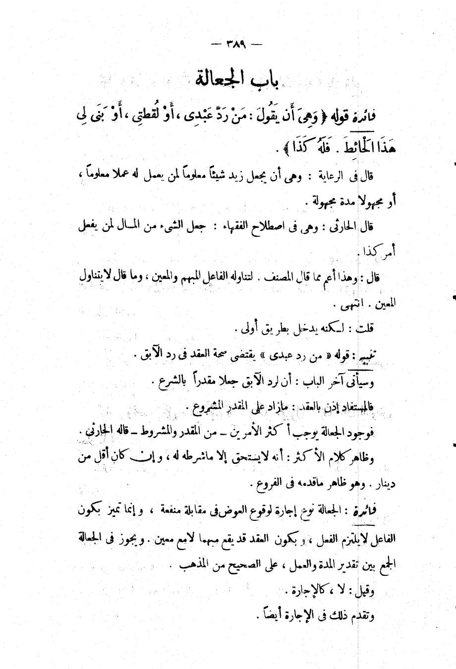 ِ فَائِدَةٌ قَوْلُهُ (وَهِيَ أَنْ يَقُولَ: مَنْ رَدَّ عَبْدِي، أَوْ لُقَطَتِي، أَوْ بَنَى لِي هَذَا الْحَائِطَ. فَلَهُ كَذَا) . قَالَ فِي الرِّعَايَةِ: وَهِيَ أَنْ يَجْعَلَ زَيْدٌ شَيْئًا مَعْلُومًا لِمَنْ يَعْمَلُ لَهُ عَمَلًا مَعْلُومًا، أَوْ مَجْهُولًا مُدَّةً مَجْهُولَةً. قَالَ الْحَارِثِيُّ: وَهِيَ فِي اصْطِلَاحِ الْفُقَهَاءِ: جَعْلُ الشَّيْءِ مِنْ الْمَالِ لِمَنْ يَفْعَلُ أَمْرَ كَذَا. قَالَ: وَهَذَا أَعَمُّ مِمَّا قَالَ الْمُصَنِّفُ. لِتَنَاوُلِهِ الْفَاعِلَ الْمُبْهَمَ وَالْمُعَيَّنَ، وَمَا قَالَ لَا يَتَنَاوَلُ الْمُعَيَّنَ. انْتَهَى. قُلْت: لَكِنَّهُ يَدْخُلُ بِطَرِيقٍ أَوْلَى.