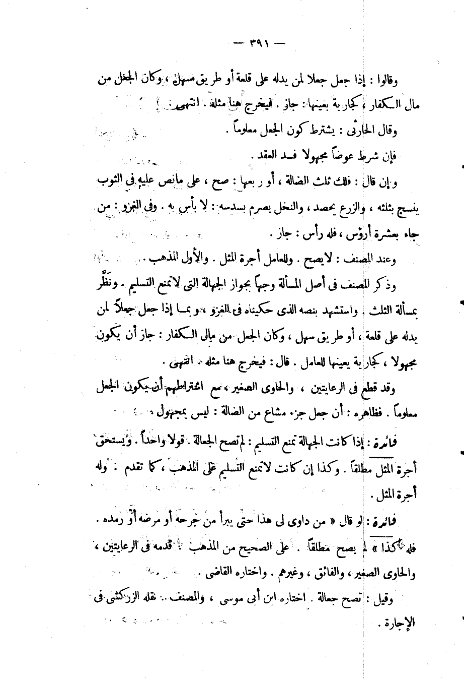 وَقَالُوا: إذَا جَعَلَ جُعْلًا لِمَنْ يَدُلُّهُ عَلَى قَلْعَةٍ أَوْ طَرِيقٍ سَهْلٍ، وَكَانَ الْجُعْلُ مِنْ مَالِ الْكُفَّارِ، كَجَارِيَةٍ بِعَيْنِهَا: جَازَ. فَيَخْرُجُ هُنَا مِثْلُهُ. انْتَهَى. وَقَالَ الْحَارِثِيُّ: يُشْتَرَطُ كَوْنُ الْجُعْلِ مَعْلُومًا. فَإِنْ شَرَطَ عِوَضًا مَجْهُولًا فَسَدَ الْعَقْدُ. وَإِنْ قَالَ: فَلَكَ ثُلُثُ الضَّالَّةِ، أَوْ رُبُعُهَا: صَحَّ، عَلَى مَا نُصَّ عَلَيْهِ فِي الثَّوْبِ يُنْسَجُ بِثُلُثِهِ، وَالزَّرْعِ يُحْصَدُ، وَالنَّخْلِ يُصْرَمُ بِسُدُسِهِ: لَا بَأْسَ بِهِ. وَفِي الْغَزْوِ: مَنْ جَاءَ بِعَشَرَةِ رُءُوسٍ، فَلَهُ رَأْسٌ: جَازَ. وَعِنْدَ الْمُصَنِّفِ: لَا يَصِحُّ. وَلِلْعَامِلِ أُجْرَةُ الْمِثْلِ. وَالْأَوَّلُ الْمَذْهَبُ. وَذَكَرَ الْمُصَنِّفُ فِي أَصْلِ الْمَسْأَلَةِ وَجْهًا بِجَوَازِ الْجَهَالَةِ الَّتِي لَا تَمْنَعُ التَّسْلِيمَ. وَنَظَرَ بِمَسْأَلَةِ الثُّلُثِ. وَاسْتَشْهَدَ بِنَصِّهِ الَّذِي حَكَيْنَاهُ فِي الْغَزْوِ، وَبِمَا إذَا جَعَلَ جُعْلًا لِمَنْ يَدُلُّهُ عَلَى قَلْعَةٍ، أَوْ طَرِيقٍ سَهْلٍ، وَكَانَ الْجُعْلُ مِنْ مَالِ الْكُفَّارِ: جَازَ أَنْ يَكُونَ مَجْهُولًا، كَجَارِيَةٍ يُعَيِّنُهَا لِلْعَامِلِ. قَالَ: فَيَخْرُجُ هُنَا مِثْلُهُ. انْتَهَى. وَقَدْ قُطِعَ فِي الرِّعَايَتَيْنِ، وَالْحَاوِي الصَّغِيرِ، مَعَ اشْتِرَاطِهِمْ أَنْ يَكُونَ الْجُعْلُ مَعْلُومًا. فَظَاهِرُهُ: أَنَّ جُعْلَ جُزْءٍ مُشَاعٍ مِنْ الضَّالَّةِ: لَيْسَ بِمَجْهُولٍ.