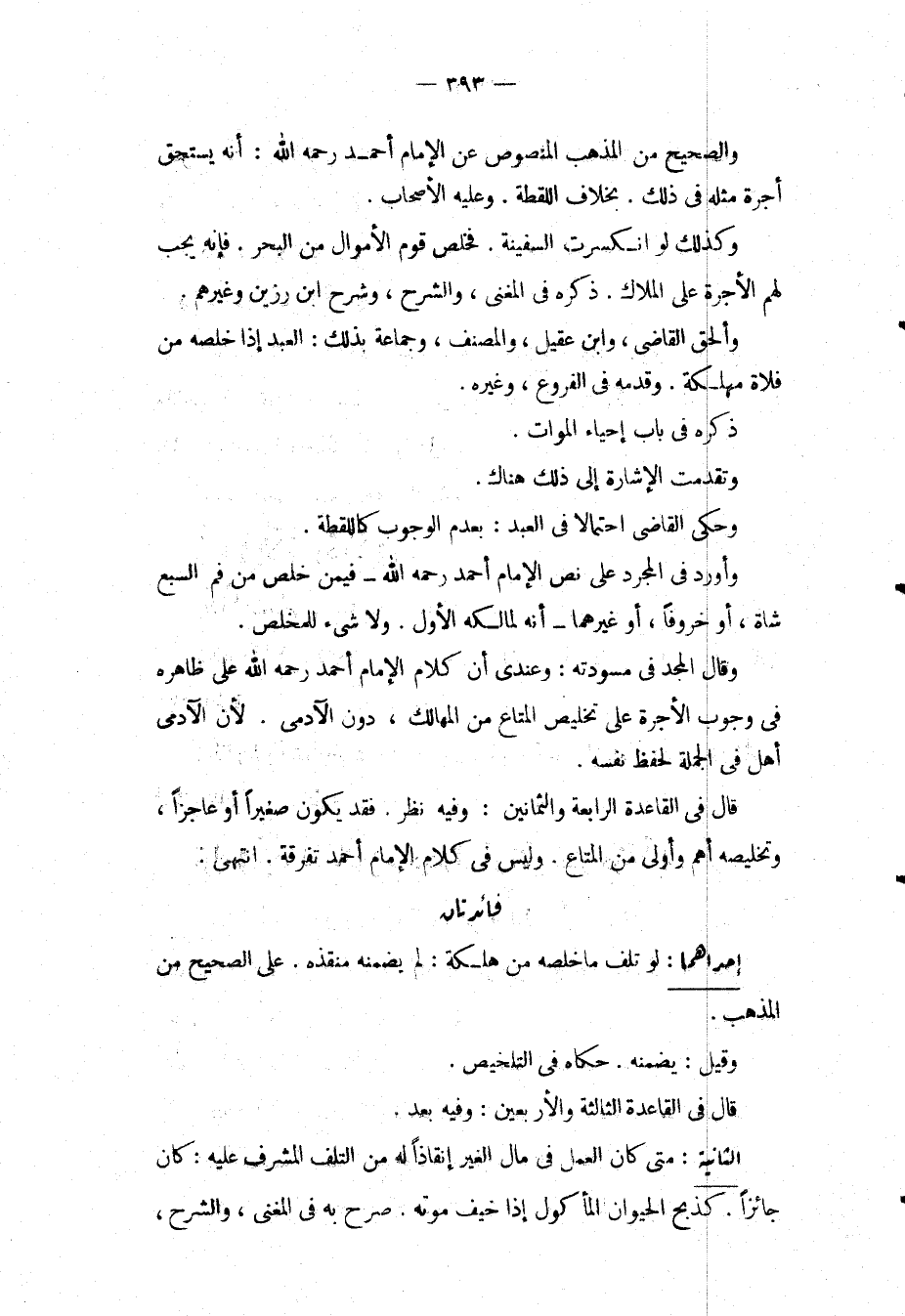 وَالصَّحِيحُ مِنْ الْمَذْهَبِ الْمَنْصُوصِ عَنْ الْإِمَامِ أَحْمَدَ - رَحِمَهُ اللَّهُ -: أَنَّهُ يَسْتَحِقُّ أُجْرَةَ مِثْلِهِ فِي ذَلِكَ. بِخِلَافِ اللُّقَطَةِ. وَعَلَيْهِ الْأَصْحَابُ. وَكَذَلِكَ لَوْ انْكَسَرَتْ السَّفِينَةُ. فَخَلَّصَ قَوْمٌ الْأَمْوَالَ مِنْ الْبَحْرِ. فَإِنَّهُ يَجِبُ لَهُمْ الْأُجْرَةُ عَلَى الْمُلَّاكِ. ذَكَرَهُ فِي الْمُغْنِي، وَالشَّرْحِ، وَشَرْحِ ابْنِ رَزِينٍ وَغَيْرِهِمْ. وَأَلْحَقَ الْقَاضِي، وَابْنُ عَقِيلٍ، وَالْمُصَنِّفُ، وَجَمَاعَةٌ بِذَلِكَ: الْعَبْدَ إذَا خَلَّصَهُ مِنْ فَلَاةٍ مُهْلِكَةٍ. وَقَدَّمَهُ فِي الْفُرُوعِ، وَغَيْرِهِ. ذَكَرَهُ فِي بَابِ إحْيَاءِ الْمَوَاتِ. وَتَقَدَّمَتْ الْإِشَارَةُ إلَى ذَلِكَ هُنَاكَ. وَحَكَى الْقَاضِي احْتِمَالًا فِي الْعَبْدِ: بِعَدَمِ الْوُجُوبِ كَاللُّقَطَةِ. وَأُورِدَ فِي الْمُجَرَّدِ عَلَى نَصِّ الْإِمَامِ أَحْمَدَ - رَحِمَهُ اللَّهُ - فِيمَنْ خَلَّصَ مِنْ فَمِ السَّبُعِ شَاةً، أَوْ خَرُوفًا، أَوْ غَيْرَهُمْ أَنَّهُ لِمَالِكِهِ الْأَوَّلِ. وَلَا شَيْءَ لِلْمُخَلِّصِ. وَقَالَ الْمَجْدُ فِي مُسَوَّدَتِهِ: وَعِنْدِي أَنَّ كَلَامَ الْإِمَامِ أَحْمَدَ - رَحِمَهُ اللَّهُ - عَلَى ظَاهِرِهِ فِي وُجُوبِ الْأُجْرَةِ عَلَى تَخْلِيصِ الْمَتَاعِ مِنْ الْمَهَالِكِ، دُونَ الْآدَمِيِّ. لِأَنَّ الْآدَمِيَّ أَهْلٌ فِي الْجُمْلَةِ لِحِفْظِ نَفْسِهِ. قَالَ فِي الْقَاعِدَةِ الرَّابِعَةِ وَالثَّمَانِينَ: وَفِيهِ نَظَرٌ. فَقَدْ يَكُونُ صَغِيرًا أَوْ عَاجِزًا، وَتَخْلِيصُهُ أَهَمُّ وَأَوْلَى مِنْ الْمَتَاعِ. وَلَيْسَ فِي كَلَامِ الْإِمَامِ أَحْمَدَ تَفْرِقَةٌ. انْتَهَى.