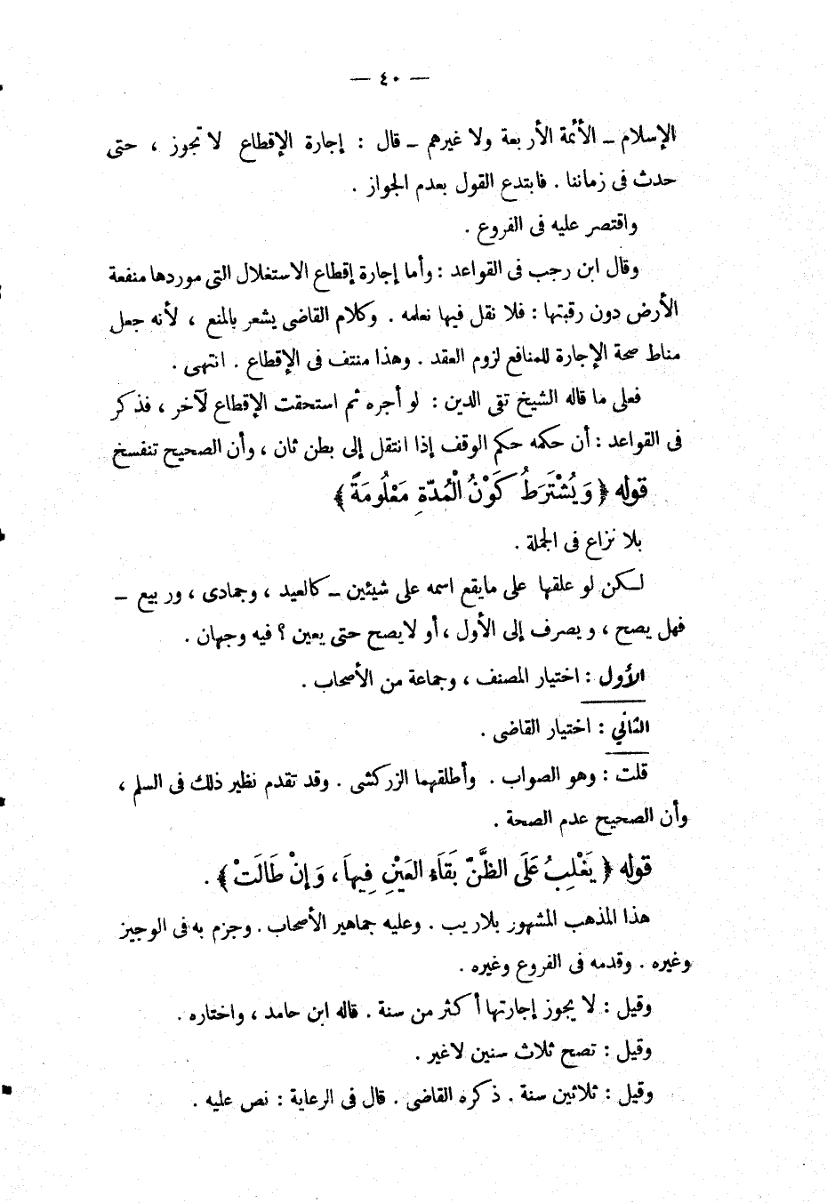 الْإِسْلَامِ الْأَئِمَّةِ الْأَرْبَعَةِ وَلَا غَيْرِهِمْ قَالَ: إجَارَةُ الْإِقْطَاعِ لَا تَجُوزُ، حَتَّى حَدَثَ فِي زَمَانِنَا. فَابْتَدَعَ الْقَوْلَ بِعَدَمِ الْجَوَازِ. وَاقْتَصَرَ عَلَيْهِ فِي الْفُرُوعِ. وَقَالَ ابْنُ رَجَبٍ فِي الْقَوَاعِدِ: وَأَمَّا إجَارَةُ إقْطَاعِ الِاسْتِغْلَالِ الَّتِي مَوْرِدُهَا مَنْفَعَةُ الْأَرْضِ دُونَ رَقَبَتِهَا: فَلَا نَقْلَ فِيهَا نَعْلَمُهُ. وَكَلَامُ الْقَاضِي يُشْعِرُ بِالْمَنْعِ، لِأَنَّهُ جَعَلَ مَنَاطَ صِحَّةِ الْإِجَارَةِ لِلْمَنَافِعِ لُزُومَ الْعَقْدِ. وَهَذَا مُنْتَفٍ فِي الْإِقْطَاعِ. انْتَهَى. فَعَلَى مَا قَالَهُ الشَّيْخُ تَقِيُّ الدِّينِ: لَوْ أَجَّرَهُ ثُمَّ اُسْتُحِقَّتْ الْإِقْطَاعُ لِآخَرَ، فَذَكَرَ فِي الْقَوَاعِدِ: أَنَّ حُكْمَهُ حُكْمُ الْوَقْفِ إذَا انْتَقَلَ إلَى بَطْنٍ ثَانٍ، وَأَنَّ الصَّحِيحَ تَنْفَسِخُ.
