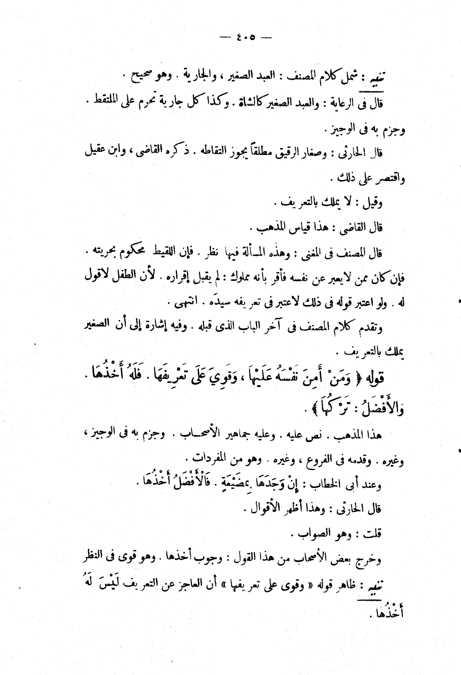 تَنْبِيهٌ: شَمِلَ كَلَامُ الْمُصَنِّفِ: الْعَبْدَ الصَّغِيرَ، وَالْجَارِيَةَ. وَهُوَ صَحِيحٌ. قَالَ فِي الرِّعَايَةِ: وَالْعَبْدُ الصَّغِيرُ كَالشَّاةِ. وَكَذَا كُلُّ جَارِيَةٍ تَحْرُمُ عَلَى الْمُلْتَقِطِ. وَجَزَمَ بِهِ فِي الْوَجِيزِ. قَالَ الْحَارِثِيُّ: وَصِغَارُ الرَّقِيقِ مُطْلَقًا يَجُوزُ الْتِقَاطُهُ. ذَكَرَهُ الْقَاضِي، وَابْنُ عَقِيلٍ وَاقْتَصَرَ عَلَى ذَلِكَ. وَقِيلَ: لَا يَمْلِكُ بِالتَّعْرِيفِ. قَالَ الْقَاضِي: هَذَا قِيَاسُ الْمَذْهَبِ. قَالَ الْمُصَنِّفُ فِي الْمُغْنِي: وَهَذِهِ الْمَسْأَلَةُ فِيهَا نَظَرٌ. فَإِنَّ اللَّقِيطَ مَحْكُومٌ بِحُرِّيَّتِهِ. فَإِنْ كَانَ مِمَّنْ لَا يُعَبِّرُ عَنْ نَفْسِهِ فَأَقَرَّ بِأَنَّهُ مَمْلُوكٌ: لَمْ يُقْبَلْ إقْرَارُهُ. لِأَنَّ الطِّفْلَ لَا قَوْلَ لَهُ. وَلَوْ اُعْتُبِرَ قَوْلُهُ فِي ذَلِكَ لَاعْتُبِرَ فِي تَعْرِيفِهِ سَيِّدَهُ. انْتَهَى. وَتَقَدَّمَ كَلَامُ الْمُصَنِّفِ فِي آخِرِ الْبَابِ الَّذِي قَبْلَهُ. وَفِيهِ إشَارَةٌ إلَى أَنَّ الصَّغِيرَ يُمْلَكُ بِالتَّعْرِيفِ.