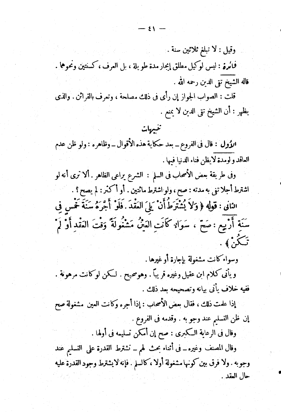 تَنْبِيهَاتٌ: الْأَوَّلُ: قَالَ فِي الْفُرُوعِ بَعْدَ حِكَايَةِ هَذِهِ الْأَقْوَالِ وَظَاهِرُهُ: وَلَوْ ظَنَّ عَدَمَ الْعَاقِدِ وَلَوْ مُدَّةً لَا يُظَنُّ فِنَاءُ الدُّنْيَا فِيهَا. وَفِي طَرِيقَةِ بَعْضِ الْأَصْحَابِ فِي السَّلَمِ: الشَّرْعُ يُرَاعِي الظَّاهِرَ. أَلَا تَرَى أَنَّهُ لَوْ اشْتَرَطَ أَجَلًا تَفِي بِهِ مُدَّتُهُ: صَحَّ، وَلَوْ اشْتَرَطَ مِائَتَيْنِ. أَوْ أَكْثَرَ: لَمْ يَصِحَّ؟ . الثَّانِي: قَوْلُهُ (وَلَا يُشْتَرَطُ أَنْ يَلِيَ الْعَقْدَ. فَلَوْ أَجَّرَهُ سَنَةَ خَمْسٍ فِي سَنَةِ أَرْبَعٍ: صَحَّ، سَوَاءٌ كَانَتْ الْعَيْنُ مَشْغُولَةً وَقْتَ الْعَقْدِ أَوْ لَمْ تَكُنْ) . وَسَوَاءٌ كَانَتْ مَشْغُولَةً بِإِجَارَةٍ أَوْ غَيْرِهَا. وَيَأْتِي كَلَامُ ابْنِ عَقِيلٍ وَغَيْرِهِ قَرِيبًا. وَهُوَ صَحِيحٌ. لَكِنْ لَوْ كَانَتْ مَرْهُونَةً. فَفِيهِ خِلَافٌ يَأْتِي بَيَانُهُ وَتَصْحِيحُهُ بَعْدَ ذَلِكَ. إذَا عَلِمْت ذَلِكَ، فَقَالَ بَعْضُ الْأَصْحَابِ: إذَا أَجَّرَهُ وَكَانَتْ الْعَيْنُ مَشْغُولَةً صَحَّ إنْ ظَنَّ التَّسْلِيمَ عِنْدَ وُجُوبِهِ. وَقَدَّمَهُ فِي الْفُرُوعِ. وَقَالَ فِي الرِّعَايَةِ الْكُبْرَى: صَحَّ إنْ أَمْكَنَ تَسْلِيمُهُ أَوَّلَهَا. وَقَالَ الْمُصَنِّفُ وَغَيْرُهُ فِي أَثْنَاءِ بَحْثٍ لَهُمْ تُشْتَرَطُ الْقُدْرَةُ عَلَى التَّسْلِيمِ عِنْدَ وُجُوبِهِ. وَلَا فَرْقَ بَيْنَ كَوْنِهَا مَشْغُولَةً أَوْ لَا كَالسَّلَمِ. فَإِنَّهُ لَا يُشْتَرَطُ وُجُودُ الْقُدْرَةِ عَلَيْهِ حَالَ الْعَقْدِ.