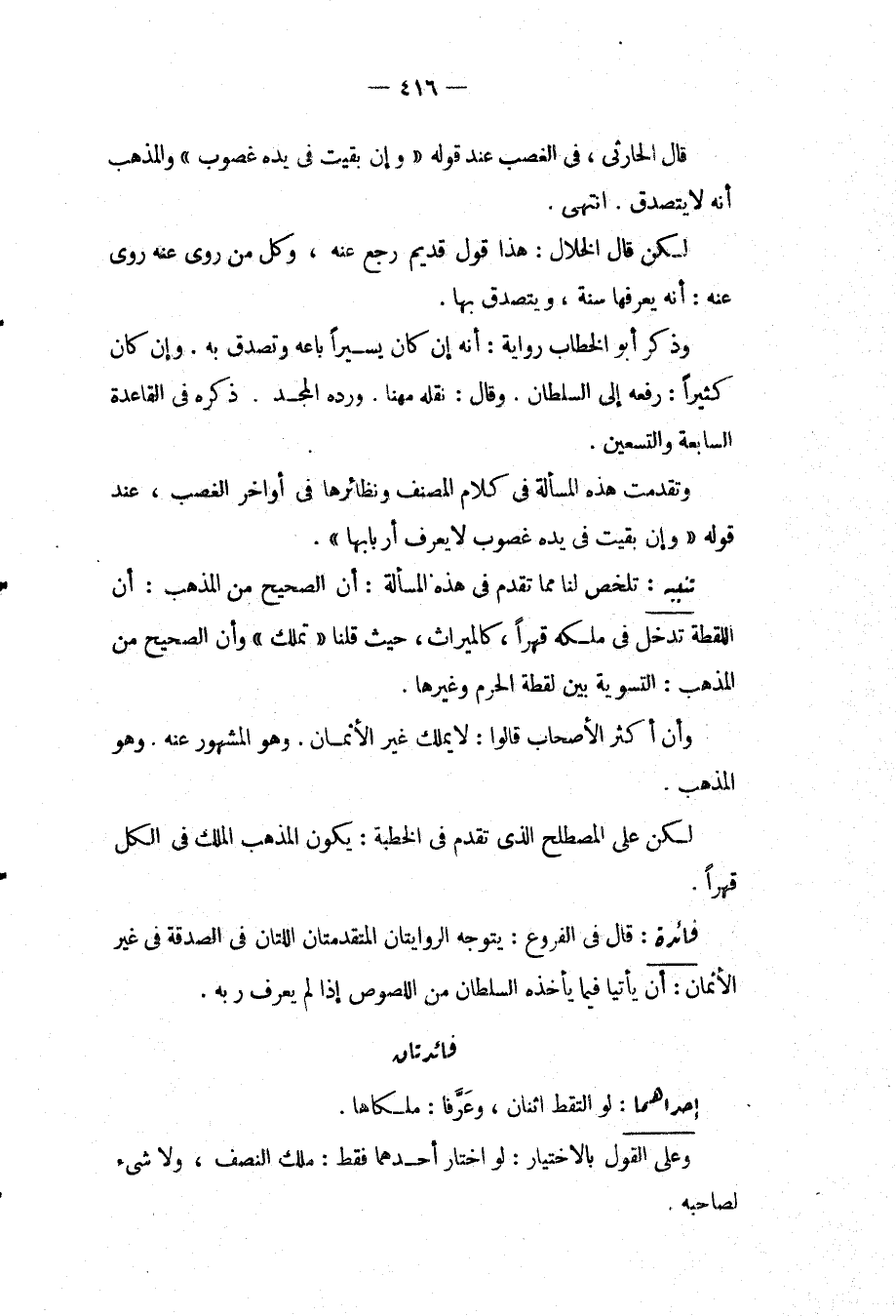 قَالَ الْحَارِثِيُّ، فِي الْغَصْبِ عِنْدَ قَوْلِهِ " وَإِنْ بَقِيَتْ فِي يَدِهِ غُصُوبٌ " وَالْمَذْهَبُ أَنَّهُ لَا يَتَصَدَّقُ. انْتَهَى. لَكِنْ قَالَ الْخَلَّالُ: هَذَا قَوْلٌ قَدِيمٌ رَجَعَ عَنْهُ، وَكُلُّ مَنْ رَوَى عَنْهُ رَوَى عَنْهُ: أَنَّهُ يُعَرِّفُهَا سَنَةً، وَيَتَصَدَّقُ بِهَا. وَذَكَرَ أَبُو الْخَطَّابِ رِوَايَةً: أَنَّهُ إنْ كَانَ يَسِيرًا بَاعَهُ وَتَصَدَّقَ بِهِ. وَإِنْ كَانَ كَثِيرًا: رَفَعَهُ إلَى السُّلْطَانِ. وَقَالَ: نَقَلَهُ مُهَنَّا. وَرَدَّهُ الْمَجْدُ. ذَكَرَهُ فِي الْقَاعِدَةِ السَّابِعَةِ وَالتِّسْعِينَ. وَتَقَدَّمَتْ هَذِهِ الْمَسْأَلَةُ فِي كَلَامِ الْمُصَنِّفِ وَنَظَائِرُهَا فِي أَوَاخِرِ الْغَصْبِ، عِنْدَ قَوْلِهِ " وَإِنْ بَقِيَتْ فِي يَدِهِ غُصُوبٌ لَا يَعْرِفُ أَرْبَابَهَا ".