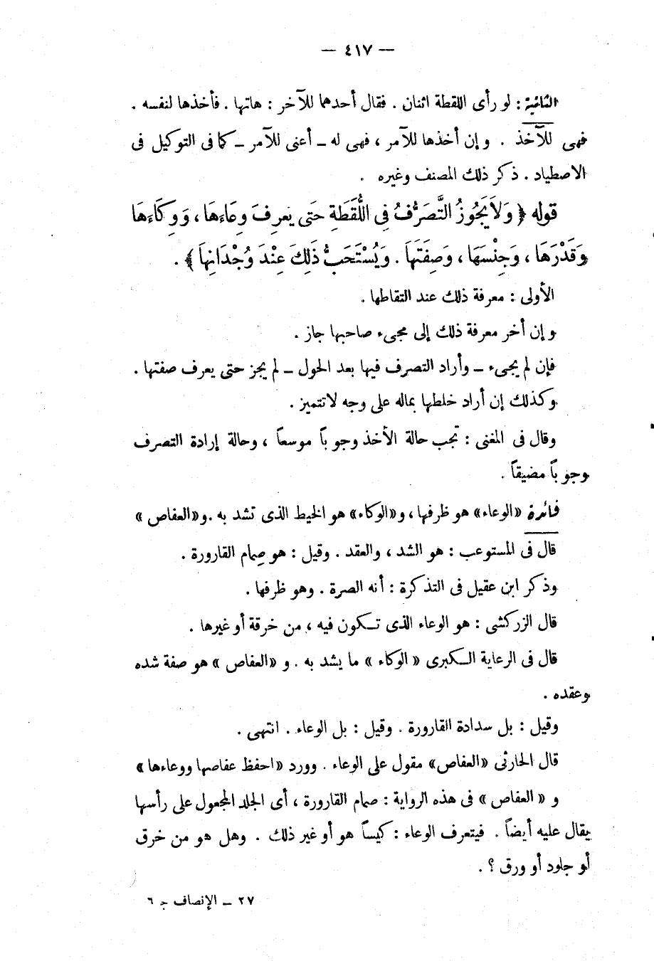 فَائِدَةٌ: " الْوِعَاءُ " هُوَ ظَرْفُهَا، " وَالْوِكَاءُ " هُوَ الْخَيْطُ الَّذِي تُشَدُّ بِهِ. " وَالْعِفَاصُ " قَالَ فِي الْمُسْتَوْعِبِ: هُوَ الشَّدُّ، وَالْعَقْدُ. وَقِيلَ: هُوَ صِمَامُ الْقَارُورَةِ. وَذَكَرَ ابْنُ عَقِيلٍ فِي التَّذْكِرَةِ: أَنَّهُ الصُّرَّةُ. وَهُوَ ظَرْفُهَا. قَالَ الزَّرْكَشِيُّ: هُوَ الْوِعَاءُ الَّذِي تَكُونُ فِيهِ، مِنْ خِرْقَةٍ أَوْ غَيْرِهَا. قَالَ فِي الرِّعَايَةِ الْكُبْرَى " الْوِكَاءُ " مَا يُشَدُّ بِهِ. " وَالْعِفَاصُ " هُوَ صِفَةُ شَدِّهِ وَعَقْدِهِ. وَقِيلَ: بَلْ سِدَادَةُ الْقَارُورَةِ. وَقِيلَ: بَلْ الْوِعَاءُ. انْتَهَى. قَالَ الْحَارِثِيُّ " الْعِفَاصُ " مَقُولٌ عَلَى الْوِعَاءِ. وَوَرَدَ «احْفَظْ عِفَاصَهَا وَوِعَاءَهَا» " وَالْعِفَاصُ " فِي هَذِهِ الرِّوَايَةِ: صِمَامُ الْقَارُورَةِ، أَيْ الْجِلْدُ الْمَجْعُولُ عَلَى رَأْسِهَا يُقَالُ عَلَيْهِ أَيْضًا. فَيَتَعَرَّفُ الْوِعَاءَ: كِيسًا هُوَ أَوْ غَيْرَ ذَلِكَ. وَهَلْ هُوَ مِنْ خِرَقٍ أَوْ جُلُودٍ أَوْ وَرَقٍ؟ .