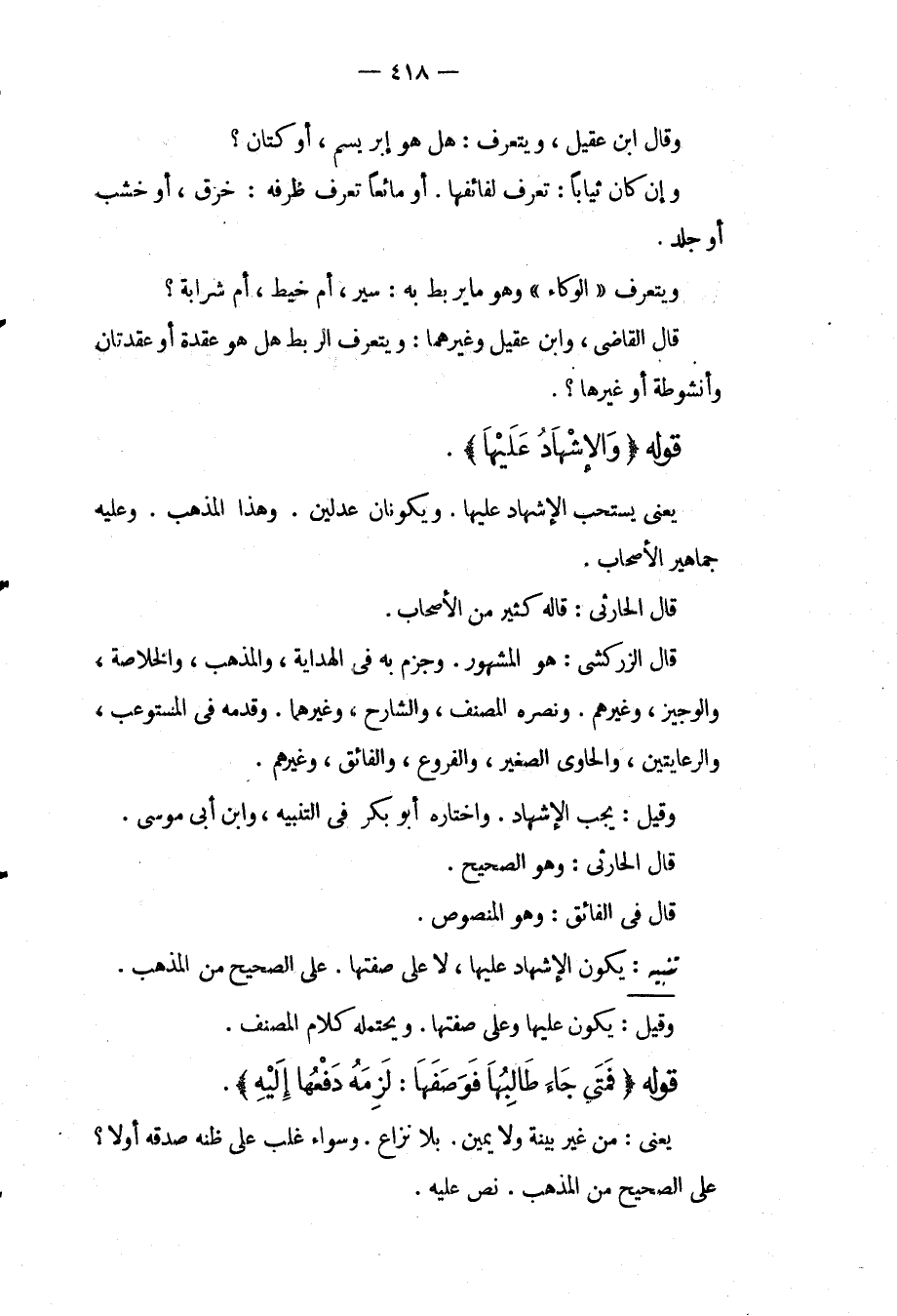 قَوْلُهُ (وَالْإِشْهَادُ عَلَيْهَا) . يَعْنِي يُسْتَحَبُّ الْإِشْهَادُ عَلَيْهَا. وَيَكُونَانِ عَدْلَيْنِ. وَهَذَا الْمَذْهَبُ. وَعَلَيْهِ جَمَاهِيرُ الْأَصْحَابِ. قَالَ الْحَارِثِيُّ: قَالَهُ كَثِيرٌ مِنْ الْأَصْحَابِ. قَالَ الزَّرْكَشِيُّ: هُوَ الْمَشْهُورُ. وَجَزَمَ بِهِ فِي الْهِدَايَةِ، وَالْمُذْهَبِ، وَالْخُلَاصَةِ، وَالْوَجِيزِ، وَغَيْرِهِمْ. وَنَصَرَهُ الْمُصَنِّفُ، وَالشَّارِحُ، وَغَيْرُهُمَا. وَقَدَّمَهُ فِي الْمُسْتَوْعِبِ، وَالرِّعَايَتَيْنِ، وَالْحَاوِي الصَّغِيرِ، وَالْفُرُوعِ، وَالْفَائِقِ، وَغَيْرِهِمْ. وَقِيلَ: يَجِبُ الْإِشْهَادُ. وَاخْتَارَهُ أَبُو بَكْرٍ فِي التَّنْبِيهِ، وَابْنُ أَبِي مُوسَى. قَالَ الْحَارِثِيُّ: وَهُوَ الصَّحِيحُ. قَالَ فِي الْفَائِقِ: وَهُوَ الْمَنْصُوصُ.