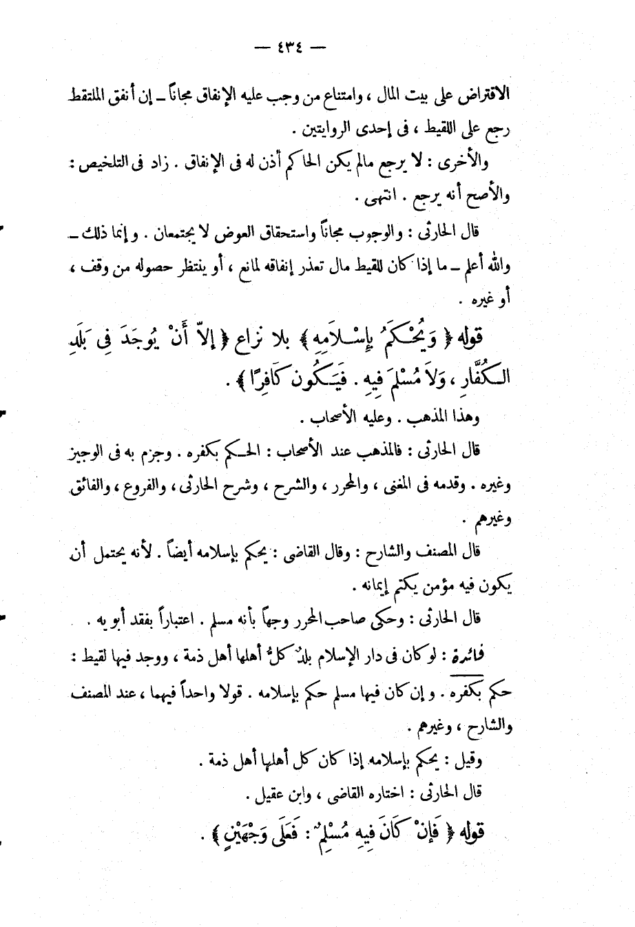 الِاقْتِرَاضِ عَلَى بَيْتِ الْمَالِ، وَامْتِنَاعِ مَنْ وَجَبَ عَلَيْهِ الْإِنْفَاقُ إنْ أَنْفَقَ الْمُلْتَقِطُ رَجَعَ عَلَى اللَّقِيطِ، فِي إحْدَى الرِّوَايَتَيْنِ. وَالْأُخْرَى: لَا يَرْجِعُ مَا لَمْ يَكُنْ الْحَاكِمُ أَذِنَ لَهُ فِي الْإِنْفَاقِ. زَادَ فِي التَّلْخِيصِ. وَالْأَصَحُّ أَنَّهُ يَرْجِعُ. انْتَهَى. قَالَ الْحَارِثِيُّ: وَالْوُجُوبُ مَجَّانًا وَاسْتِحْقَاقُ الْعِوَضِ لَا يَجْتَمِعَانِ. وَإِنَّمَا ذَلِكَ وَاَللَّهُ أَعْلَمُ مَا إذَا كَانَ لِلَّقِيطِ مَالٌ تَعَذَّرَ إنْفَاقُهُ لِمَانِعٍ، أَوْ يُنْتَظَرُ حُصُولُهُ مِنْ وَقْفٍ، أَوْ غَيْرِهِ. قَوْلُهُ (وَيُحْكَمُ بِإِسْلَامِهِ) بِلَا نِزَاعٍ (إلَّا أَنْ يُوجَدَ فِي بَلَدِ الْكُفَّارِ، وَلَا مُسْلِمَ فِيهِ. فَيَكُونُ كَافِرًا) . وَهَذَا الْمَذْهَبُ. وَعَلَيْهِ الْأَصْحَابُ. قَالَ الْحَارِثِيُّ: فَالْمَذْهَبُ عِنْدَ الْأَصْحَابِ: الْحُكْمُ بِكُفْرِهِ. وَجَزَمَ بِهِ فِي الْوَجِيزِ وَغَيْرِهِ. وَقَدَّمَهُ فِي الْمُغْنِي، وَالْمُحَرَّرِ، وَالشَّرْحِ، وَشَرْحِ الْحَارِثِيِّ، وَالْفُرُوعِ، وَالْفَائِقِ وَغَيْرِهِمْ. قَالَ الْمُصَنِّفُ وَالشَّارِحُ: وَقَالَ الْقَاضِي: يُحْكَمُ بِإِسْلَامِهِ أَيْضًا. لِأَنَّهُ يُحْتَمَلُ أَنْ يَكُونَ فِيهِ مُؤْمِنٌ يَكْتُمُ إيمَانَهُ. قَالَ الْحَارِثِيُّ: وَحَكَى صَاحِبُ الْمُحَرَّرِ وَجْهًا بِأَنَّهُ مُسْلِمٌ. اعْتِبَارًا بِفَقْدِ أَبَوَيْهِ.