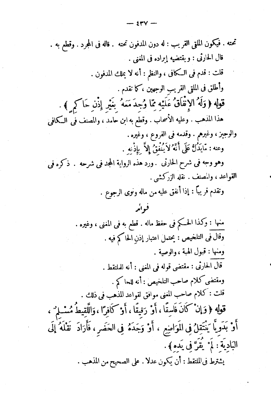 فَوَائِدُ: مِنْهَا: وَكَذَا الْحُكْمُ فِي حِفْظِ مَالِهِ. قَطَعَ بِهِ فِي الْمُغْنِي، وَغَيْرِهِ. وَقَالَ فِي التَّلْخِيصِ: يُحْتَمَلُ اعْتِبَارُ إذْنِ الْحَاكِمِ فِيهِ. وَمِنْهَا: قَبُولُ الْهِبَةِ، وَالْوَصِيَّةِ. قَالَ الْحَارِثِيُّ: مُقْتَضَى قَوْلِهِ فِي الْمُغْنِي: أَنَّهُ لِلْمُلْتَقِطِ. وَمُقْتَضَى كَلَامِ صَاحِبِ التَّلْخِيصِ: أَنَّهُ لِلْحَاكِمِ. قُلْت: كَلَامُ صَاحِبِ الْمُغْنِي مُوَافِقٌ لِقَوَاعِدِ الْمَذْهَبِ فِي ذَلِكَ.