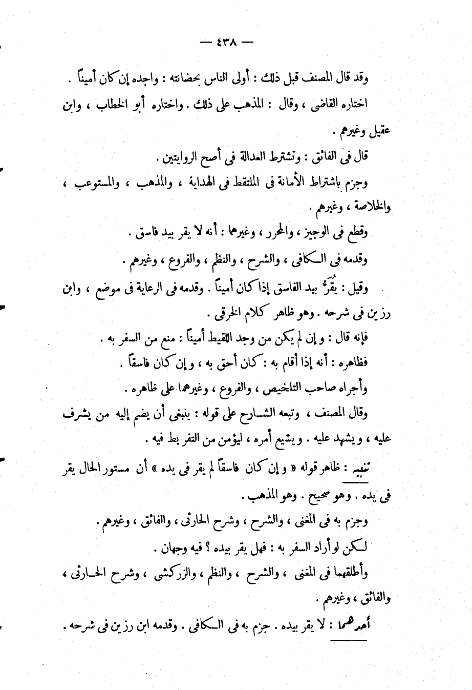وَقَدْ قَالَ الْمُصَنِّفُ قَبْلَ ذَلِكَ: أَوْلَى النَّاسِ بِحَضَانَتِهِ: وَاجِدُهُ إنْ كَانَ أَمِينًا. اخْتَارَهُ الْقَاضِي، وَقَالَ: الْمَذْهَبُ عَلَى ذَلِكَ. وَاخْتَارَهُ أَبُو الْخَطَّابِ، وَابْنُ عَقِيلٍ وَغَيْرُهُمْ. قَالَ فِي الْفَائِقِ: وَتُشْتَرَطُ الْعَدَالَةُ فِي أَصَحِّ الرِّوَايَتَيْنِ. وَجَزَمَ بِاشْتِرَاطِ الْأَمَانَةِ فِي الْمُلْتَقِطِ فِي الْهِدَايَةِ، وَالْمُذْهَبِ، وَالْمُسْتَوْعِبِ، وَالْخُلَاصَةِ، وَغَيْرِهِمْ. وَقَطَعَ فِي الْوَجِيزِ، وَالْمُحَرَّرِ، وَغَيْرِهِمَا: أَنَّهُ لَا يُقَرُّ بِيَدِ فَاسِقٍ. وَقَدَّمَهُ فِي الْكَافِي، وَالشَّرْحِ، وَالنَّظْمِ، وَالْفُرُوعِ، وَغَيْرِهِمْ. وَقِيلَ: يُقَرُّ بِيَدِ الْفَاسِقِ إذَا كَانَ أَمِينًا. وَقَدَّمَهُ فِي الرِّعَايَةِ فِي مَوْضِعٍ، وَابْنُ رَزِينٍ فِي شَرْحِهِ. وَهُوَ ظَاهِرُ كَلَامِ الْخِرَقِيِّ. فَإِنَّهُ قَالَ: وَإِنْ لَمْ يَكُنْ مَنْ وَجَدَ اللَّقِيطَ أَمِينًا: مُنِعَ مِنْ السَّفَرِ بِهِ. فَظَاهِرُهُ: أَنَّهُ إذَا أَقَامَ بِهِ: كَانَ أَحَقَّ بِهِ، وَإِنْ كَانَ فَاسِقًا. وَأَجْرَاهُ صَاحِبُ التَّلْخِيصِ، وَالْفُرُوعِ، وَغَيْرُهُمَا عَلَى ظَاهِرِهِ. وَقَالَ الْمُصَنِّفُ، وَتَبِعَهُ الشَّارِحُ عَلَى قَوْلِهِ: يَنْبَغِي أَنْ يُضَمَّ إلَيْهِ مَنْ يُشْرِفُ عَلَيْهِ، وَيَشْهَدُ عَلَيْهِ. وَيُشِيعُ أَمْرَهُ، لِيُؤْمَنَ مِنْ التَّفْرِيطِ فِيهِ.