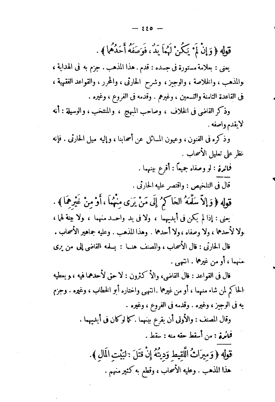 فَائِدَةٌ: لَوْ وَصَفَاهُ جَمِيعًا: أُقْرِعَ بَيْنَهُمَا. قَالَ فِي التَّلْخِيصِ: وَاقْتَصَرَ عَلَيْهِ الْحَارِثِيُّ. قَوْلُهُ (وَإِلَّا سَلَّمَهُ الْحَاكِمُ إلَى مَنْ يَرَى مِنْهُمَا، أَوْ مِنْ غَيْرِهِمَا) . يَعْنِي: إذَا لَمْ يَكُنْ فِي أَيْدِيهِمَا، وَلَا فِي يَدِ وَاحِدٍ مِنْهُمَا، وَلَا بَيِّنَةَ لَهُمَا، وَلَا لِأَحَدِهِمَا، وَلَا وَصَفَاهُ، وَلَا أَحَدُهُمَا. وَهَذَا الْمَذْهَبُ. وَعَلَيْهِ جَمَاهِيرُ الْأَصْحَابِ. قَالَ الْحَارِثِيُّ: قَالَ الْأَصْحَابُ، وَالْمُصَنِّفُ هُنَا: يُسَلِّمُهُ الْقَاضِي إلَى مَنْ يَرَى مِنْهُمَا، أَوْ مِنْ غَيْرِهِمَا. انْتَهَى. قَالَ فِي الْقَوَاعِدِ: قَالَ الْقَاضِي، وَالْأَكْثَرُونَ: لَا حَقَّ لِأَحَدِهِمَا فِيهِ، وَيُعْطِيهِ الْحَاكِمُ لِمَنْ شَاءَ مِنْهُمَا، أَوْ مِنْ غَيْرِهِمَا. انْتَهَى وَاخْتَارَهُ أَبُو الْخَطَّابِ، وَغَيْرُهُ. وَجَزَمَ بِهِ فِي الْوَجِيزِ، وَغَيْرِهِ. وَقَدَّمَهُ فِي الْفُرُوعِ، وَغَيْرِهِ. وَقَالَ الْمُصَنِّفُ: وَالْأَوْلَى أَنْ يُقْرَعَ بَيْنَهُمَا. كَمَا لَوْ كَانَ فِي أَيْدِيهِمَا.