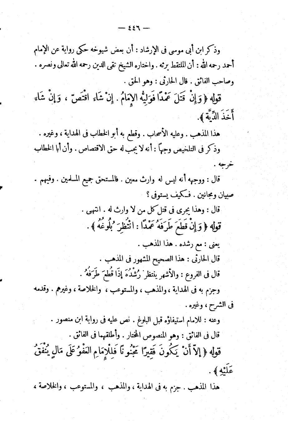 وَذَكَرَ ابْنُ أَبِي مُوسَى فِي الْإِرْشَادِ: أَنَّ بَعْضَ شُيُوخِهِ حَكَى رِوَايَةً عَنْ الْإِمَامِ أَحْمَدَ - رَحِمَهُ اللَّهُ -: أَنَّ الْمُلْتَقِطَ يَرِثُهُ. وَاخْتَارَهُ الشَّيْخُ تَقِيُّ الدِّينِ - رَحِمَهُ اللَّهُ تَعَالَى - وَنَصَرَهُ. وَصَاحِبُ الْفَائِقِ. قَالَ الْحَارِثِيُّ: وَهُوَ الْحَقُّ. قَوْلُهُ (وَإِنْ قَتَلَ عَمْدًا فَوَلِيُّهُ الْإِمَامُ. إنْ شَاءَ اقْتَصَّ، وَإِنْ شَاءَ أَخَذَ الدِّيَةَ) . هَذَا الْمَذْهَبُ. وَعَلَيْهِ الْأَصْحَابُ. وَقَطَعَ بِهِ أَبُو الْخَطَّابِ فِي الْهِدَايَةِ، وَغَيْرِهِ. وَذَكَرَ فِي التَّلْخِيصِ وَجْهًا: أَنَّهُ لَا يَجِبُ لَهُ حَقُّ الِاقْتِصَاصِ. وَأَنَّ أَبَا الْخَطَّابِ خَرَّجَهُ. قَالَ: وَوَجْهُهُ أَنَّهُ لَيْسَ لَهُ وَارِثٌ مُعَيَّنٌ. فَالْمُسْتَحِقُّ جَمِيعُ الْمُسْلِمِينَ. وَفِيهِمْ. صِبْيَانٌ وَمَجَانِينُ. فَكَيْفَ يُسْتَوْفَى؟ قَالَ: وَهَذَا يَجْرِي فِي قَتْلِ كُلِّ مَنْ لَا وَارِثَ لَهُ. انْتَهَى. قَوْلُهُ (وَإِنْ قَطَعَ طَرَفَهُ عَمْدًا: اُنْتُظِرَ بُلُوغُهُ) . يَعْنِي: مَعَ رُشْدِهِ. هَذَا الْمَذْهَبُ. قَالَ الْحَارِثِيُّ: هَذَا الصَّحِيحُ الْمَشْهُورُ فِي الْمَذْهَبِ. قَالَ فِي الْفُرُوعِ: وَالْأَشْهَرُ يُنْتَظَرُ رُشْدُهُ إذَا قُطِعَ طَرَفُهُ. وَجَزَمَ بِهِ فِي الْهِدَايَةِ، وَالْمُذْهَبِ، وَالْمُسْتَوْعِبِ، وَالْخُلَاصَةِ، وَغَيْرِهِمْ. وَقَدَّمَهُ فِي الشَّرْحِ، وَغَيْرِهِ. وَعَنْهُ: لِلْإِمَامِ اسْتِيفَاؤُهُ قَبْلَ الْبُلُوغِ. نُصَّ عَلَيْهِ فِي رِوَايَةِ ابْنِ مَنْصُورٍ. قَالَ فِي الْفَائِقِ: وَهُوَ الْمَنْصُوصُ الْمُخْتَارُ. وَأَطْلَقَهُمَا فِي الْفَائِقِ. قَوْلُهُ (إلَّا أَنْ يَكُونَ فَقِيرًا مَجْنُونًا فَلِلْإِمَامِ الْعَفْوُ عَلَى مَالٍ يُنْفَقُ عَلَيْهِ) . هَذَا الْمَذْهَبُ. جَزَمَ بِهِ فِي الْهِدَايَةِ، وَالْمُذْهَبِ، وَالْمُسْتَوْعِبِ، وَالْخُلَاصَةِ،