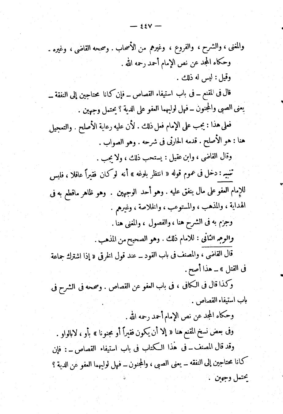وَالْمُغْنِي، وَالشَّرْحِ، وَالْفُرُوعِ، وَغَيْرِهِمْ مِنْ الْأَصْحَابِ. وَصَحَّحَهُ الْقَاضِي، وَغَيْرُهُ. وَحَكَاهُ الْمَجْدُ عَنْ نَصِّ الْإِمَامِ أَحْمَدَ - رَحِمَهُ اللَّهُ -. وَقِيلَ: لَيْسَ لَهُ ذَلِكَ. قَالَ فِي الْمُقْنِعِ فِي بَابِ اسْتِيفَاءِ الْقِصَاصِ فَإِنْ كَانَا مُحْتَاجَيْنِ إلَى النَّفَقَةِ يَعْنِي الصَّبِيُّ وَالْمَجْنُونَ فَهَلْ لِوَلِيِّهِمَا الْعَفْوُ عَلَى الدِّيَةِ؟ يَحْتَمِلُ وَجْهَيْنِ. فَعَلَى هَذَا: يَجِبُ عَلَى الْإِمَامِ فِعْلُ ذَلِكَ. لِأَنَّ عَلَيْهِ رِعَايَةَ الْأَصْلَحِ. وَالتَّعْجِيلُ هُنَا: هُوَ الْأَصْلَحُ. قَدَّمَهُ الْحَارِثِيُّ فِي شَرْحِهِ. وَهُوَ الصَّوَابُ. وَقَالَ الْقَاضِي، وَابْنُ عَقِيلٍ: يُسْتَحَبُّ ذَلِكَ، وَلَا يَجِبُ.
