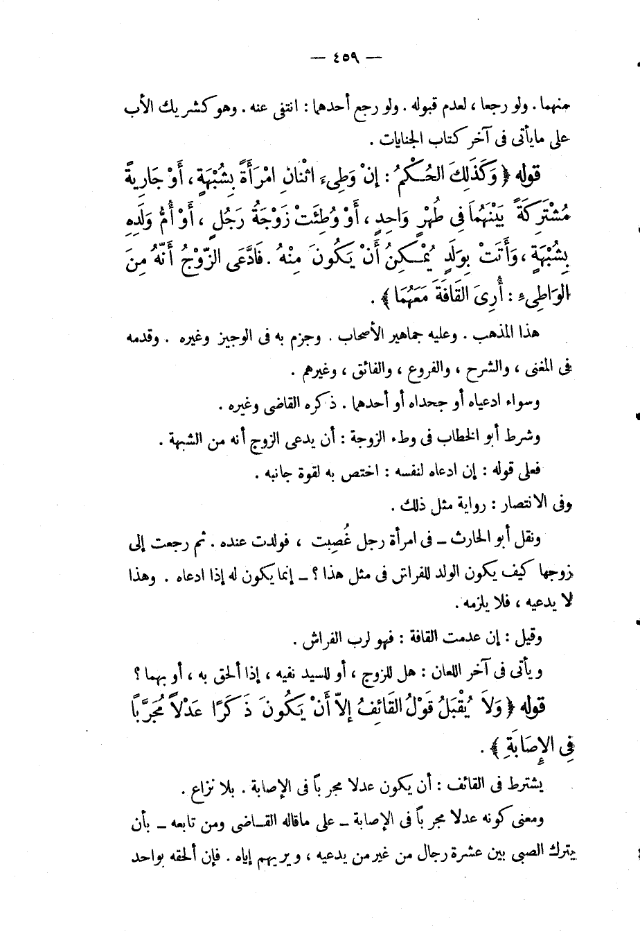 قَوْلُهُ (وَكَذَلِكَ الْحُكْمُ: إنْ وَطِئَ اثْنَانِ امْرَأَةً بِشُبْهَةٍ، أَوْ جَارِيَةً مُشْتَرِكَةً بَيْنَهُمَا فِي طُهْرٍ وَاحِدٍ، أَوْ وُطِئَتْ زَوْجَةُ رَجُلٍ، أَوْ أُمُّ وَلَدِهِ بِشُبْهَةٍ، وَأَتَتْ بِوَلَدٍ يُمْكِنُ أَنْ يَكُونَ مِنْهُ. فَادَّعَى الزَّوْجُ أَنَّهُ مِنْ الْوَاطِئِ: أُرِيَ الْقَافَةَ مَعَهُمَا) . هَذَا الْمَذْهَبُ. وَعَلَيْهِ جَمَاهِيرُ الْأَصْحَابِ. وَجَزَمَ بِهِ فِي الْوَجِيزِ وَغَيْرِهِ. وَقَدَّمَهُ فِي الْمُغْنِي، وَالشَّرْحِ، وَالْفُرُوعِ، وَالْفَائِقِ، وَغَيْرِهِمْ. وَسَوَاءٌ ادَّعَيَاهُ أَوْ جَحَدَاهُ أَوْ أَحَدُهُمَا. ذَكَرَهُ الْقَاضِي وَغَيْرُهُ. وَشَرَطَ أَبُو الْخَطَّابِ فِي وَطْءِ الزَّوْجَةِ: أَنْ يَدَّعِيَ الزَّوْجُ أَنَّهُ مِنْ الشُّبْهَةِ. فَعَلَى قَوْلِهِ: إنْ ادَّعَاهُ لِنَفْسِهِ: اخْتَصَّ بِهِ لِقُوَّةِ جَانِبِهِ. وَفِي الِانْتِصَارِ: رِوَايَةٌ مِثْلُ ذَلِكَ. وَنَقَلَ أَبُو الْحَارِثِ فِي امْرَأَةِ رَجُلٍ غُصِبَتْ، فَوَلَدَتْ عِنْدَهُ. ثُمَّ رَجَعَتْ إلَى زَوْجِهَا كَيْفَ يَكُونُ الْوَلَدُ لِلْفِرَاشِ فِي مِثْلِ هَذَا؟ إنَّمَا يَكُونُ لَهُ إذَا ادَّعَاهُ. وَهَذَا لَا يَدَّعِيهِ، فَلَا يَلْزَمُهُ. وَقِيلَ: إنْ عُدِمَتْ الْقَافَةُ: فَهُوَ لِرَبِّ الْفِرَاشِ. وَيَأْتِي فِي آخِرِ اللِّعَانِ: هَلْ لِلزَّوْجِ، أَوْ لِلسَّيِّدِ نَفْيُهُ، إذَا أُلْحِقَ بِهِ، أَوْ بِهِمَا؟ قَوْلُهُ (وَلَا يُقْبَلُ قَوْلُ الْقَائِفِ إلَّا أَنْ يَكُونَ ذَكَرًا عَدْلًا مُجَرَّبًا فِي الْإِصَابَةِ) . يُشْتَرَطُ فِي الْقَائِفِ: أَنْ يَكُونَ عَدْلًا مُجَرَّبًا فِي الْإِصَابَةِ. بِلَا نِزَاعٍ. وَمَعْنَى كَوْنِهِ عَدْلًا مُجَرَّبًا فِي الْإِصَابَةِ عَلَى مَا قَالَهُ الْقَاضِي وَمَنْ تَابَعَهُ بِأَنْ يُتْرَكَ الصَّبِيُّ بَيْنَ عَشَرَةِ رِجَالٍ مِنْ غَيْرِ مَنْ يَدَّعِيهِ، وَيُرِيَهُمْ إيَّاهُ. فَإِنْ أَلْحَقَهُ بِوَاحِدٍ