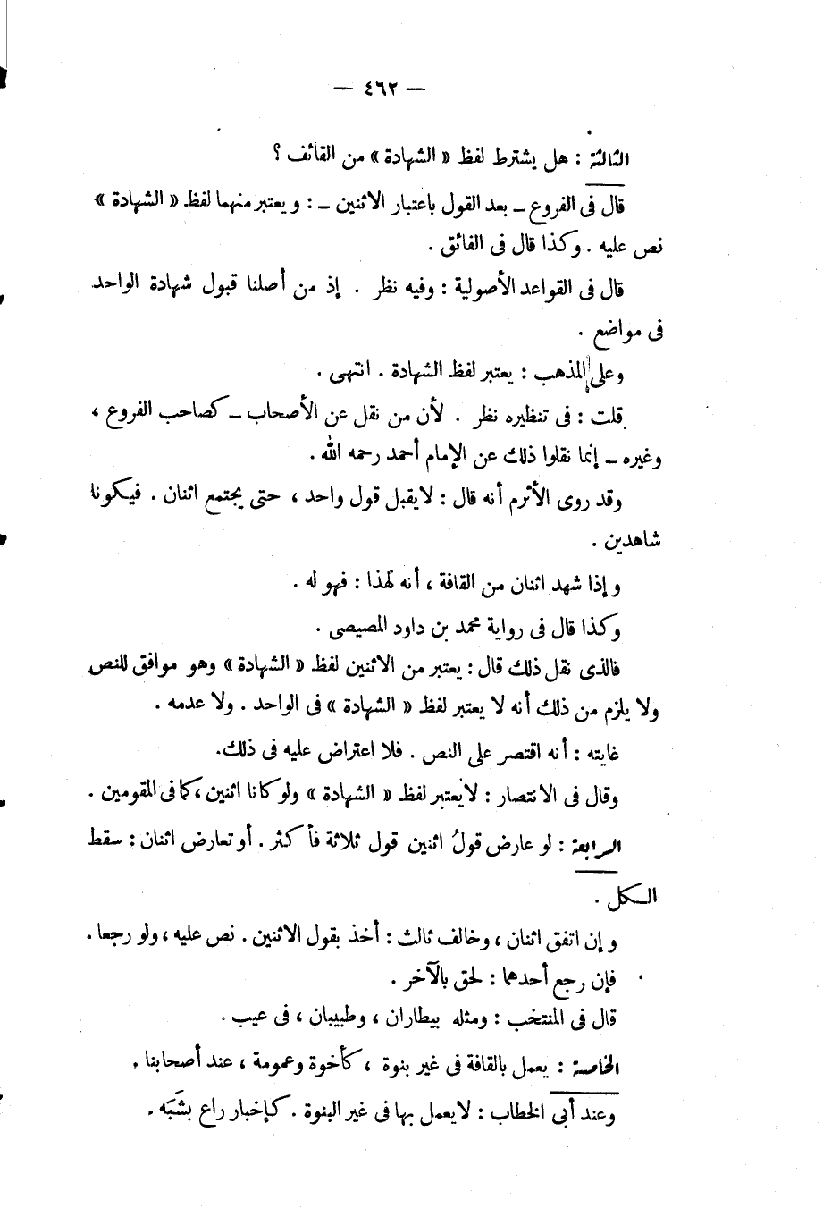 الثَّالِثَةُ: هَلْ يُشْتَرَطُ لَفْظُ " الشَّهَادَةِ " مِنْ الْقَائِفِ؟ قَالَ فِي الْفُرُوعِ بَعْدَ الْقَوْلِ بِاعْتِبَارِ الِاثْنَيْنِ: وَيُعْتَبَرُ مِنْهُمَا لَفْظُ " الشَّهَادَةِ " نُصَّ عَلَيْهِ. وَكَذَا قَالَ فِي الْفَائِقِ. قَالَ فِي الْقَوَاعِدِ الْأُصُولِيَّةِ: وَفِيهِ نَظَرٌ. إذْ مِنْ أَصْلِنَا قَبُولُ شَهَادَةِ الْوَاحِدِ فِي مَوَاضِعَ. وَعَلَى الْمَذْهَبِ: يُعْتَبَرُ لَفْظُ الشَّهَادَةِ. انْتَهَى. قُلْت: فِي تَنْظِيرِهِ نَظَرٌ. لِأَنَّ مَنْ نَقَلَ عَنْ الْأَصْحَابِ كَصَاحِبِ الْفُرُوعِ، وَغَيْرِهِ إنَّمَا نَقَلُوا ذَلِكَ عَنْ الْإِمَامِ أَحْمَدَ - رَحِمَهُ اللَّهُ -. وَقَدْ رَوَى الْأَثْرَمُ أَنَّهُ قَالَ: لَا يُقْبَلُ قَوْلٌ وَاحِدٌ، حَتَّى يَجْتَمِعَ اثْنَانِ. فَيَكُونَا شَاهِدَيْنِ. وَإِذَا شَهِدَ اثْنَانِ مِنْ الْقَافَةِ، أَنَّهُ لِهَذَا: فَهُوَ لَهُ. وَكَذَا قَالَ فِي رِوَايَةِ مُحَمَّدِ بْنِ دَاوُد الْمِصِّيصِيِّ. فَاَلَّذِي نَقَلَ ذَلِكَ قَالَ: يُعْتَبَرُ مِنْ الِاثْنَيْنِ لَفْظُ " الشَّهَادَةِ " وَهُوَ مُوَافِقٌ لِلنَّصِّ وَلَا يَلْزَمُ مِنْ ذَلِكَ أَنَّهُ لَا يُعْتَبَرُ لَفْظُ " الشَّهَادَةِ " فِي الْوَاحِدِ. وَلَا عَدَمُهُ. غَايَتُهُ: أَنَّهُ اقْتَصَرَ عَلَى النَّصِّ. فَلَا اعْتِرَاضَ عَلَيْهِ فِي ذَلِكَ. وَقَالَ فِي الِانْتِصَارِ: لَا يُعْتَبَرُ لَفْظُ " الشَّهَادَةِ " وَلَوْ كَانَا اثْنَيْنِ كَمَا فِي الْمُقَوِّمِينَ.