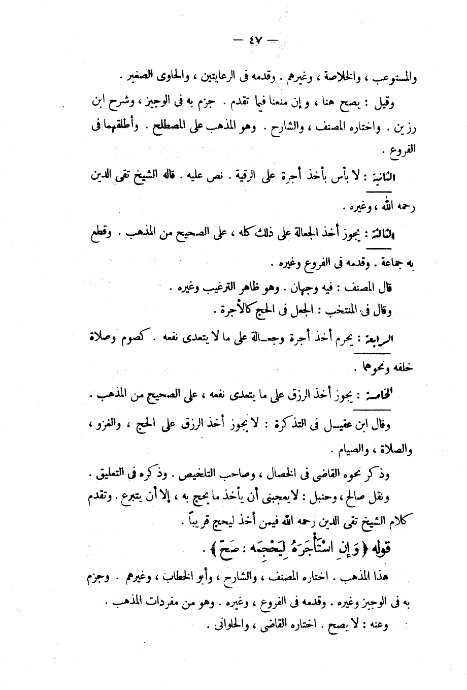الْخَامِسَةُ: يَجُوزُ أَخْذُ الرِّزْقِ عَلَى مَا يَتَعَدَّى نَفْعُهُ، عَلَى الصَّحِيحِ مِنْ الْمَذْهَبِ. وَقَالَ ابْنُ عَقِيلٍ فِي التَّذْكِرَةِ: لَا يَجُوزُ أَخْذُ الرِّزْقِ عَلَى الْحَجِّ، وَالْغَزْوِ، وَالصَّلَاةِ، وَالصِّيَامِ. وَذَكَرَ نَحْوَهُ الْقَاضِي فِي الْخِصَالِ، وَصَاحِبُ التَّلْخِيصِ. وَذَكَرَهُ فِي التَّعْلِيقِ. وَنَقَلَ صَالِحٌ، وَحَنْبَلٌ: لَا يُعْجِبُنِي أَنْ يَأْخُذَ مَا يَحُجُّ بِهِ، إلَّا أَنْ يَتَبَرَّعَ. وَتَقَدَّمَ كَلَامُ الشَّيْخِ تَقِيُّ الدِّينِ - رَحِمَهُ اللَّهُ - فِيمَنْ أَخَذَ لِيَحُجَّ قَرِيبًا.