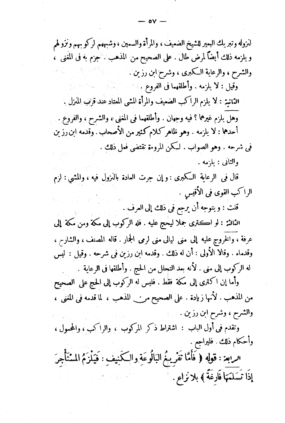 الثَّانِيَةُ: لَا يَلْزَمُ الرَّاكِبَ الضَّعِيفَ وَالْمَرْأَةَ الْمَشْيُ الْمُعْتَادُ عِنْدَ قُرْبِ الْمَنْزِلِ. وَهَلْ يَلْزَمُ غَيْرَهُمَا؟ فِيهِ وَجْهَانِ. وَأَطْلَقَهُمَا فِي الْمُغْنِي وَالشَّرْحِ، وَالْفُرُوعِ. أَحَدُهُمَا: لَا يَلْزَمُهُ. وَهُوَ ظَاهِرُ كَلَامِ كَثِيرٍ مِنْ الْأَصْحَابِ. وَقَدَّمَهُ ابْنُ رَزِينٍ فِي شَرْحِهِ. وَهُوَ الصَّوَابُ. لَكِنَّ الْمُرُوءَةَ تَقْتَضِي فِعْلَ ذَلِكَ. وَالثَّانِي: يَلْزَمُهُ. قَالَ فِي الرِّعَايَةِ الْكُبْرَى: وَإِنْ جَرَتْ الْعَادَةُ بِالنُّزُولِ فِيهِ، وَالْمَشْيِ: لَزِمَ الرَّاكِبَ الْقَوِيَّ فِي الْأَقْيَسِ. قُلْت: وَيَتَوَجَّهُ أَنْ يَرْجِعَ فِي ذَلِكَ إلَى الْعُرْفِ. الثَّالِثَةُ: لَوْ اكْتَرَى جَمَلًا لِيَحُجَّ عَلَيْهِ. فَلَهُ الرُّكُوبُ إلَى مَكَّةَ وَمِنْ مَكَّةَ إلَى عَرَفَةَ وَالْخُرُوجُ عَلَيْهِ إلَى مِنًى لَيَالِيَ مِنًى لِرَمْيِ الْجِمَارِ. قَالَهُ الْمُصَنِّفُ، وَالشَّارِحُ، وَقُدَمَاءُ. وَقَالَا الْأَوْلَى: أَنَّ لَهُ ذَلِكَ. وَقَدَّمَهُ ابْنُ رَزِينٍ فِي شَرْحِهِ. وَقِيلَ: لَيْسَ لَهُ الرُّكُوبُ إلَى مِنًى. لِأَنَّهُ بَعْدَ التَّحَلُّلِ مِنْ الْحَجِّ. وَأَطْلَقَهَا فِي الرِّعَايَةِ وَأَمَّا إنْ اكْتَرَى إلَى مَكَّةَ فَقَطْ. فَلَيْسَ لَهُ الرُّكُوبُ إلَى الْحَجِّ عَلَى الصَّحِيحِ مِنْ الْمَذْهَبِ. لِأَنَّهَا زِيَادَةٌ. عَلَى الصَّحِيحِ مِنْ الْمَذْهَبِ، لِمَا قَدَّمَهُ فِي الْمُغْنِي، وَالشَّرْحِ، وَشَرْحِ ابْنِ رَزِينٍ. وَتَقَدَّمَ فِي أَوَّلِ الْبَابِ: اشْتِرَاطُ ذِكْرِ الْمَرْكُوبِ، وَالرَّاكِبِ، وَالْمَحْمُولِ، وَأَحْكَامُ ذَلِكَ. فَلْيُرَاجَعْ.