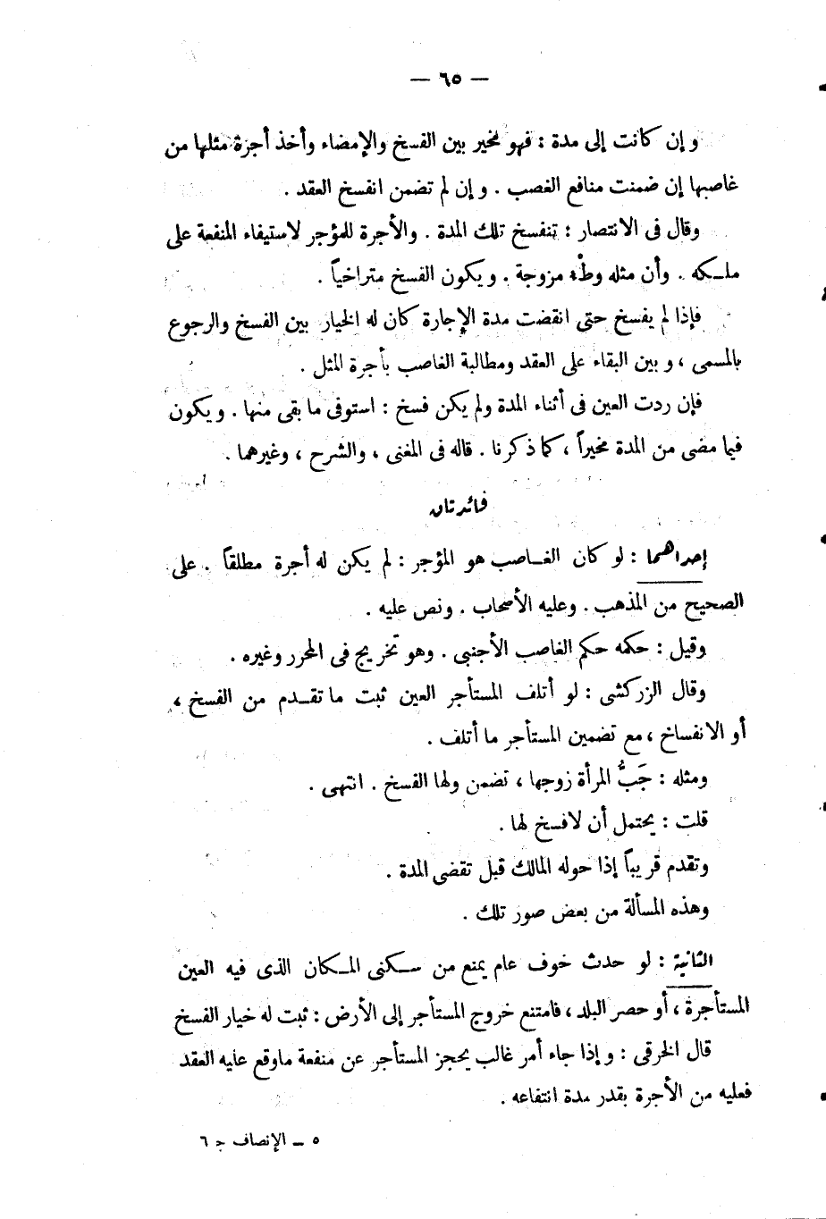 فَائِدَتَانِ: إحْدَاهُمَا: لَوْ كَانَ الْغَاصِبُ هُوَ الْمُؤَجِّرَ: لَمْ يَكُنْ لَهُ أُجْرَةٌ مُطْلَقًا. عَلَى الصَّحِيحِ مِنْ الْمَذْهَبِ. وَعَلَيْهِ الْأَصْحَابُ. وَنَصَّ عَلَيْهِ. وَقِيلَ: حُكْمُهُ حُكْمُ الْغَاصِبِ الْأَجْنَبِيِّ. وَهُوَ تَخْرِيجٌ فِي الْمُحَرَّرِ وَغَيْرِهِ. وَقَالَ الزَّرْكَشِيُّ: لَوْ أَتْلَفَ الْمُسْتَأْجِرُ الْعَيْنَ ثَبَتَ مَا تَقَدَّمَ مِنْ الْفَسْخِ، أَوْ الِانْفِسَاخِ، مَعَ تَضْمِينِ الْمُسْتَأْجِرِ مَا أَتْلَفَ. وَمِثْلُهُ: جَبُّ الْمَرْأَةِ زَوْجَهَا، تَضْمَنُ وَلَهَا الْفَسْخُ. انْتَهَى. قُلْت: يَحْتَمِلُ أَنْ لَا فَسْخَ لَهَا. وَتَقَدَّمَ قَرِيبًا إذَا حَوَّلَهُ الْمَالِكُ قَبْلَ تَقَضِّي الْمُدَّةِ. وَهَذِهِ الْمَسْأَلَةُ مِنْ بَعْضِ صُوَرِ تِلْكَ.