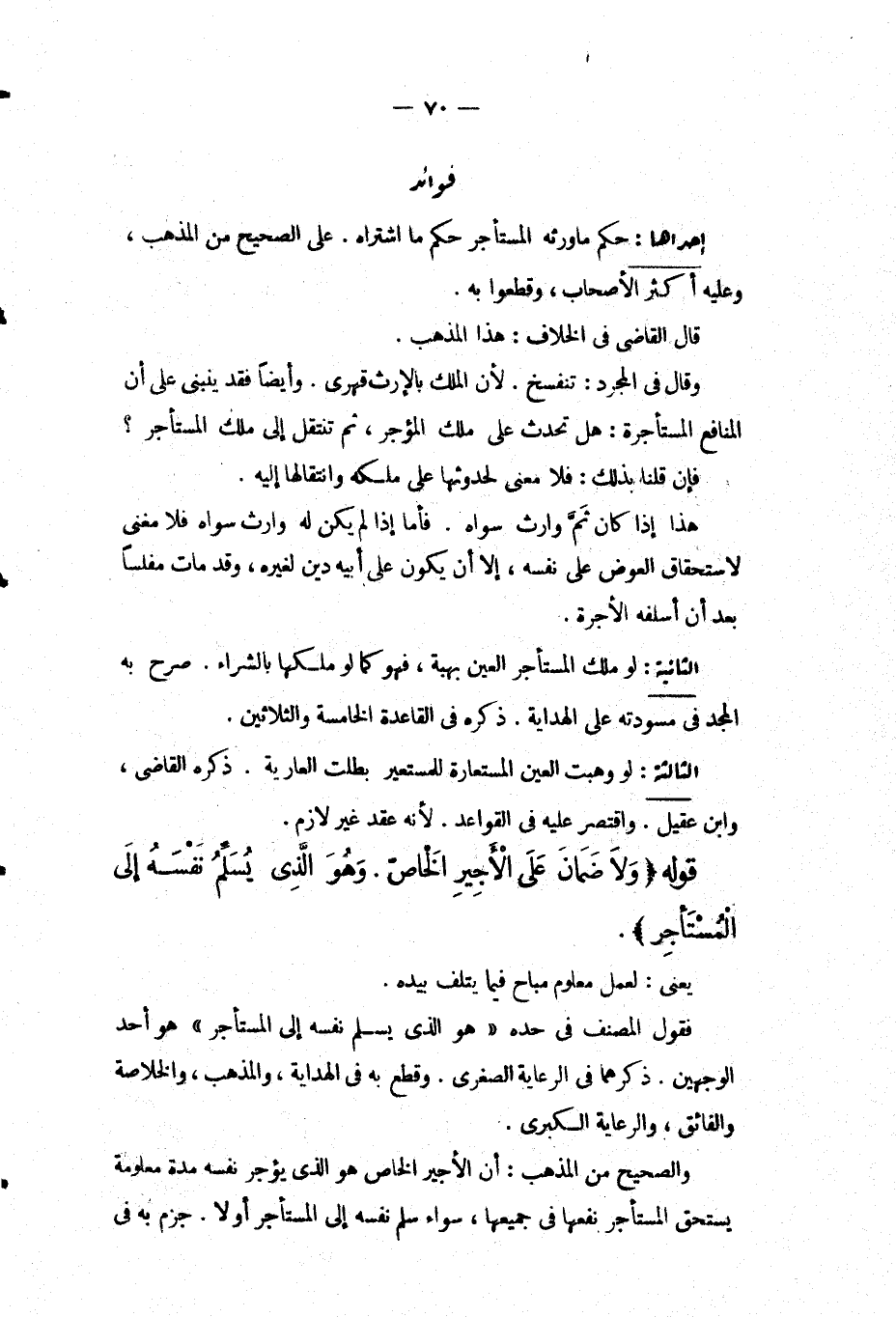 فَوَائِدُ: إحْدَاهَا: حُكْمُ مَا وَرِثَهُ الْمُسْتَأْجِرُ حُكْمُ مَا اشْتَرَاهُ. عَلَى الصَّحِيحِ مِنْ الْمَذْهَبِ، وَعَلَيْهِ أَكْثَرُ الْأَصْحَابِ، وَقَطَعُوا بِهِ. قَالَ الْقَاضِي فِي الْخِلَافِ: هَذَا الْمَذْهَبُ وَقَالَ فِي الْمُجَرَّدِ: تَنْفَسِخُ. لِأَنَّ الْمِلْكَ بِالْإِرْثِ قَهْرِيٌّ. وَأَيْضًا فَقَدْ يَنْبَنِي عَلَى أَنَّ الْمَنَافِعَ الْمُسْتَأْجَرَةَ: هَلْ تَحْدُثُ عَلَى مِلْكِ الْمُؤَجِّرِ، ثُمَّ تَنْتَقِلُ إلَى مِلْكِ الْمُسْتَأْجِرِ؟ فَإِنْ قُلْنَا بِذَلِكَ: فَلَا مَعْنَى لِحُدُوثِهَا عَلَى مِلْكٍ وَانْتِقَالِهَا إلَيْهِ. هَذَا إذَا كَانَ ثَمَّ وَارِثٌ سِوَاهُ. فَأَمَّا إذَا لَمْ يَكُنْ لَهُ وَارِثٌ سِوَاهُ فَلَا مَعْنَى لِاسْتِحْقَاقِ الْعِوَضِ عَلَى نَفْسِهِ، إلَّا أَنْ يَكُونَ عَلَى أَبِيهِ دَيْنٌ لِغَيْرِهِ، وَقَدْ مَاتَ مُفْلِسًا بَعْدَ أَنْ أَسْلَفَهُ الْأُجْرَةَ.