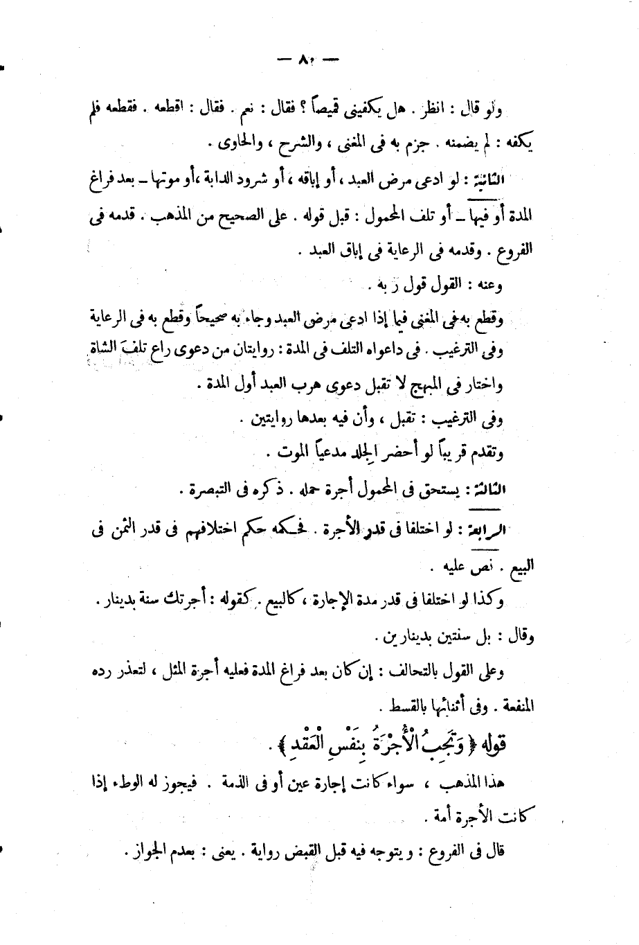 الثَّانِيَةُ: لَوْ ادَّعَى مَرَضَ الْعَبْدِ، أَوْ إبَاقَهُ، أَوْ شُرُودَ الدَّابَّةِ، أَوْ مَوْتَهَا بَعْدَ فَرَاغِ الْمُدَّةِ أَوْ فِيهَا أَوْ تَلِفَ الْمَحْمُولُ: قَبْلَ قَوْلِهِ. عَلَى الصَّحِيحِ مِنْ الْمَذْهَبِ. قَدَّمَهُ فِي الْفُرُوعِ. وَقَدَّمَهُ فِي الرِّعَايَةِ فِي إبَاقِ الْعَبْدِ. وَعَنْهُ: الْقَوْلُ قَوْلُ رَبِّهِ. وَقَطَعَ بِهِ فِي الْمُغْنِي فِيمَا إذَا ادَّعَى مَرَضَ الْعَبْدِ وَجَاءَ بِهِ صَحِيحًا وَقَطَعَ بِهِ فِي الرِّعَايَةِ وَفِي التَّرْغِيبِ. فِي دَعْوَاهُ التَّلَفَ فِي الْمُدَّةِ: رِوَايَتَانِ مِنْ دَعْوَى رَاعٍ تَلَفَ الشَّاةِ وَاخْتَارَ فِي الْمُبْهِجِ لَا تُقْبَلُ دَعْوَى هَرَبِ الْعَبْدِ أَوَّلَ الْمُدَّةِ. وَفِي التَّرْغِيبِ: تُقْبَلُ، وَأَنَّ فِيهِ بَعْدَهَا رِوَايَتَيْنِ. وَتَقَدَّمَ قَرِيبًا لَوْ أَحْضَرَ الْجِلْدَ مُدَّعِيًا الْمَوْتَ.