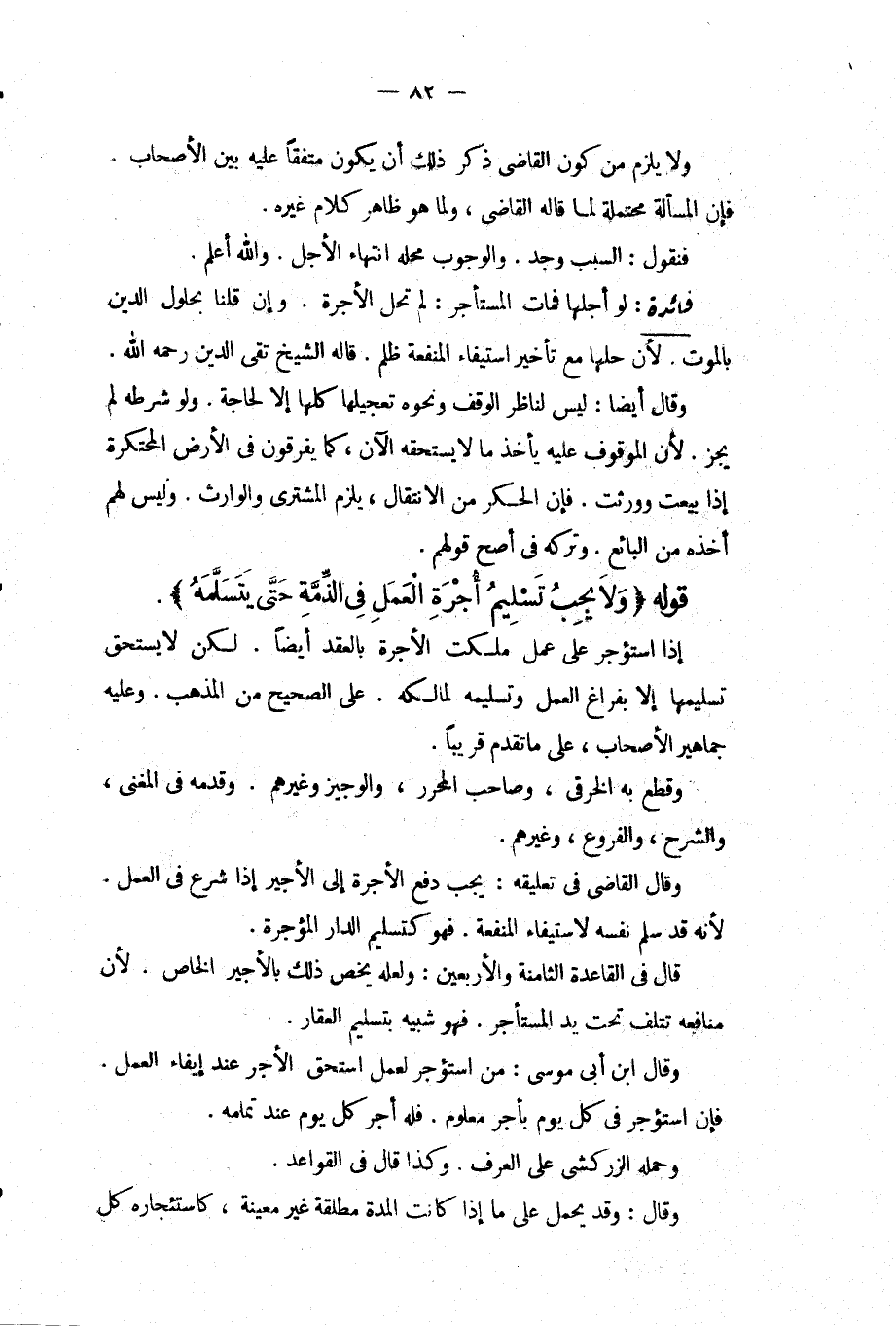 وَلَا يَلْزَمُ مِنْ كَوْنِ الْقَاضِي ذَكَرَ ذَلِكَ أَنْ يَكُونَ مُتَّفَقًا عَلَيْهِ بَيْنَ الْأَصْحَابِ. فَإِنَّ الْمَسْأَلَةَ مُحْتَمِلَةٌ لِمَا قَالَهُ الْقَاضِي، وَلِمَا هُوَ ظَاهِرُ كَلَامِ غَيْرِهِ. فَنَقُولُ: السَّبَبُ وُجِدَ. وَالْوُجُوبُ مَحَلُّهُ انْتِهَاءُ الْأَجَلِ. وَاَللَّهُ أَعْلَمُ. فَائِدَةٌ: لَوْ أَجَّلَهَا فَمَاتَ الْمُسْتَأْجِرُ: لَمْ تَحِلَّ الْأُجْرَةُ. وَإِنْ قُلْنَا بِحُلُولِ الدَّيْنِ بِالْمَوْتِ لِأَنَّ حِلَّهَا مَعَ تَأْخِيرِ اسْتِيفَاءِ الْمَنْفَعَةِ ظُلْمٌ. قَالَهُ الشَّيْخُ تَقِيُّ الدِّينِ - رَحِمَهُ اللَّهُ -. وَقَالَ أَيْضًا: لَيْسَ لِنَاظِرِ الْوَقْفِ وَنَحْوِهِ تَعْجِيلُهَا كُلِّهَا إلَّا لِحَاجَةٍ. وَلَوْ شَرَطَهُ لَمْ يَجُزْ. لِأَنَّ الْمَوْقُوفَ عَلَيْهِ يَأْخُذُ مَا لَا يَسْتَحِقُّهُ الْآنَ، كَمَا يُفَرِّقُونَ فِي الْأَرْضِ الْمُحْتَكَرَةِ إذَا بِيعَتْ وَوُرِثَتْ. فَإِنَّ الْحِكْرَ مِنْ الِانْتِقَالِ، يَلْزَمُ الْمُشْتَرِيَ وَالْوَارِثَ. وَلَيْسَ لَهُمْ أَخْذُهُ مِنْ الْبَائِعِ. وَتَرْكُهُ فِي أَصَحِّ قَوْلِهِمْ.