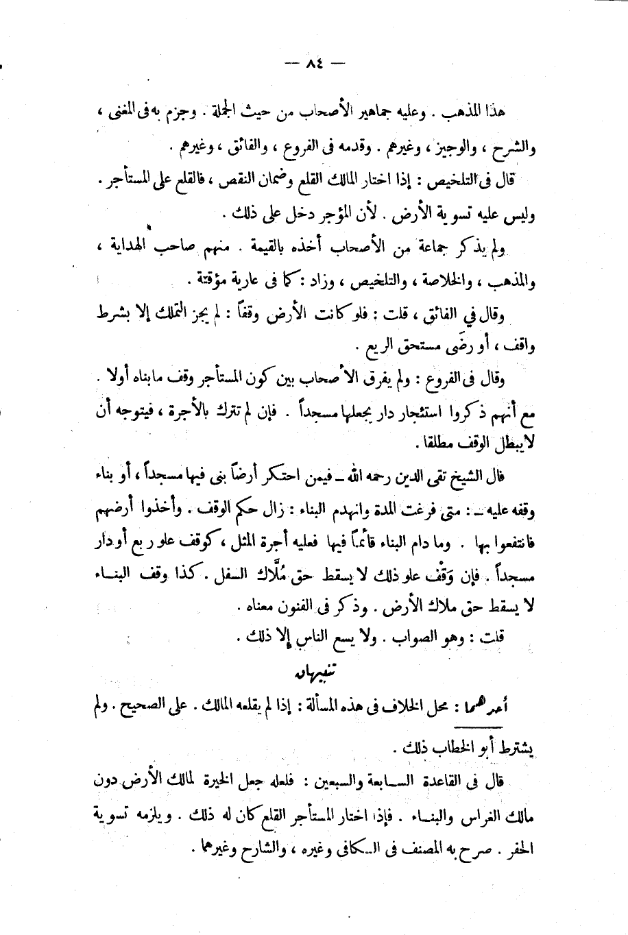 هَذَا الْمَذْهَبُ وَعَلَيْهِ جَمَاهِيرُ الْأَصْحَابِ مِنْ حَيْثُ الْجُمْلَةُ. وَجَزَمَ بِهِ فِي الْمُغْنِي، وَالشَّرْحِ، وَالْوَجِيزِ، وَغَيْرِهِمْ. وَقَدَّمَهُ فِي الْفُرُوعِ، وَالْفَائِقِ، وَغَيْرِهِمْ. قَالَ فِي التَّلْخِيصِ: إذَا اخْتَارَ الْمَالِكُ الْقَلْعَ وَضَمَانَ النَّقْصِ، فَالْقَلْعُ عَلَى الْمُسْتَأْجِرِ. وَلَيْسَ عَلَيْهِ تَسْوِيَةُ الْأَرْضِ. لِأَنَّ الْمُؤَجِّرَ دَخَلَ عَلَى ذَلِكَ. وَلَمْ يَذْكُرْ جَمَاعَةٌ مِنْ الْأَصْحَابِ أَخْذَهُ بِالْقِيمَةِ. مِنْهُمْ صَاحِبُ الْهِدَايَةِ، وَالْمُذْهَبِ، وَالْخُلَاصَةِ، وَالتَّلْخِيصِ، وَزَادَ: كَمَا فِي عَارِيَّةٍ مُؤَقَّتَةٍ. وَقَالَ فِي الْفَائِقِ، قُلْت: فَلَوْ كَانَتْ الْأَرْضُ وَقْفًا: لَمْ يَجُزْ التَّمَلُّكُ إلَّا بِشَرْطِ وَاقِفٍ، أَوْ رِضَى مُسْتَحِقِّ الرَّبْعِ. وَقَالَ فِي الْفُرُوعِ: وَلَمْ يُفَرِّقْ الْأَصْحَابُ بَيْنَ كَوْنِ الْمُسْتَأْجِرِ وَقَفَ مَا بَنَاهُ أَوْ لَا. مَعَ أَنَّهُمْ ذَكَرُوا اسْتِئْجَارَ دَارٍ يَجْعَلُهَا مَسْجِدًا. فَإِنْ لَمْ تُتْرَكْ بِالْأُجْرَةِ، فَيَتَوَجَّهُ أَنْ لَا يَبْطُلَ الْوَقْفُ مُطْلَقًا. قَالَ الشَّيْخُ تَقِيُّ الدِّينِ - رَحِمَهُ اللَّهُ - فِيمَنْ احْتَكَرَ أَرْضًا بَنَى فِيهَا مَسْجِدًا، أَوْ بِنَاءً وَقَفَهُ عَلَيْهِ: مَتَى فَرَغَتْ الْمُدَّةُ وَانْهَدَمَ الْبِنَاءُ: زَالَ حُكْمُ الْوَقْفِ. وَأَخَذُوا أَرْضَهُمْ فَانْتَفَعُوا بِهَا. وَمَا دَامَ الْبِنَاءُ قَائِمًا فِيهَا فَعَلَيْهِ أُجْرَةُ الْمِثْلِ، كَوَقْفِ عُلْوِ رَبْعٍ أَوْ دَارٍ مَسْجِدًا. فَإِنْ وَقَفَ عُلْوَ ذَلِكَ لَا يَسْقُطُ حَقُّ مُلَّاكِ السُّفْلِ. كَذَا وَقْفُ الْبِنَاءِ لَا يُسْقِطُ حَقَّ مُلَّاكِ الْأَرْضِ. وَذَكَرَ فِي الْفُنُونِ مَعْنَاهُ. قُلْت: وَهُوَ الصَّوَابُ. وَلَا يَسَعُ النَّاسَ إلَّا ذَلِكَ. تَنْبِيهَانِ: أَحَدُهُمَا: مَحَلُّ الْخِلَافِ فِي هَذِهِ الْمَسْأَلَةِ: إذَا لَمْ يَقْلَعْهُ الْمَالِكُ. عَلَى الصَّحِيحِ. وَلَمْ يَشْتَرِطْ أَبُو الْخَطَّابِ ذَلِكَ. قَالَ فِي الْقَاعِدَةِ السَّابِعَةِ وَالسَّبْعِينَ: فَلَعَلَّهُ جَعَلَ الْخِيَرَةَ لِمَالِكِ الْأَرْضِ دُونَ مَالِكِ الْغِرَاسِ وَالْبِنَاءِ. فَإِذَا اخْتَارَ الْمُسْتَأْجِرُ الْقَلْعَ كَانَ لَهُ ذَلِكَ. وَيَلْزَمُهُ تَسْوِيَةُ الْحَفْرِ. صَرَّحَ بِهِ الْمُصَنِّفُ فِي الْكَافِي وَغَيْرِهِ، وَالشَّارِحُ وَغَيْرُهُمَا.