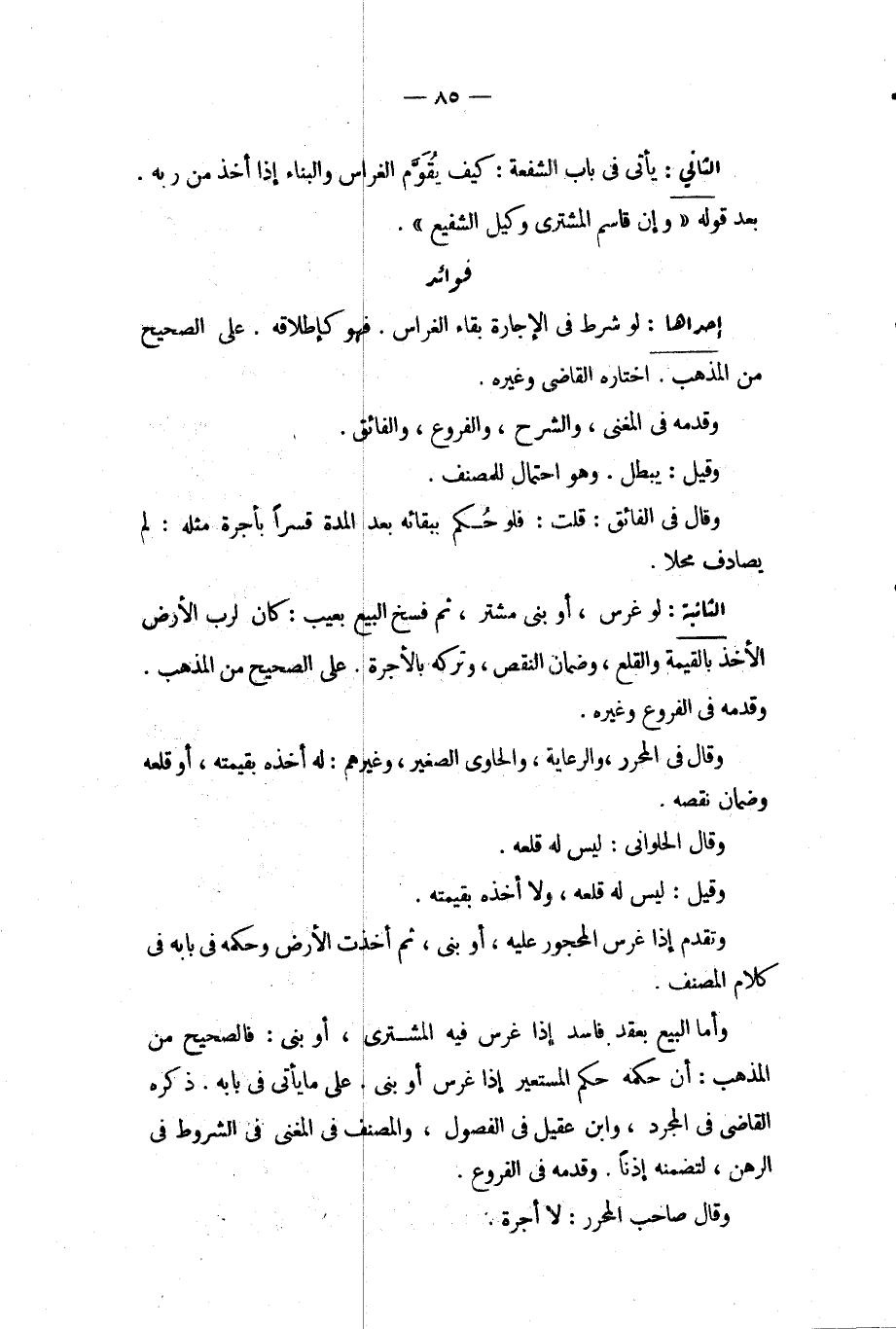 الثَّانِي: يَأْتِي فِي بَابِ الشُّفْعَةِ: كَيْفَ يُقَوَّمُ الْغِرَاسُ وَالْبِنَاءُ إذَا أُخِذَ مِنْ رَبِّهِ. بَعْدَ قَوْلِهِ " وَإِنْ قَاسَمَ الْمُشْتَرِي وَكِيلَ الشَّفِيعِ ". فَوَائِدُ: إحْدَاهَا: لَوْ شَرَطَ فِي الْإِجَارَةِ بَقَاءَ الْغِرَاسِ. فَهُوَ كَإِطْلَاقِهِ. عَلَى الصَّحِيحِ مِنْ الْمَذْهَبِ اخْتَارَهُ الْقَاضِي وَغَيْرُهُ. وَقَدَّمَهُ فِي الْمُغْنِي، وَالشَّرْحِ، وَالْفُرُوعِ، وَالْفَائِقِ. وَقِيلَ: يَبْطُلُ. وَهُوَ احْتِمَالٌ لِلْمُصَنِّفِ. وَقَالَ فِي الْفَائِقِ: قُلْت: فَلَوْ حَكَمَ بِبَقَائِهِ بَعْدَ الْمُدَّةِ قَسْرًا بِأُجْرَةِ مِثْلِهِ: لَمْ يُصَادِفْ مَحَلًّا.