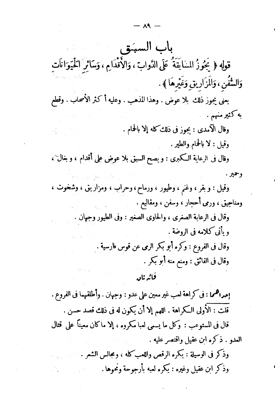 ِ قَوْلُهُ (يَجُوزُ الْمُسَابَقَةُ عَلَى الدَّوَابِّ، وَالْأَقْدَامِ، وَسَائِرِ الْحَيَوَانَاتِ وَالسُّفُنِ، وَالْمَزَارِيقِ وَغَيْرِهَا) . يَعْنِي يَجُوزُ ذَلِكَ بِلَا عِوَضٍ. وَهَذَا الْمَذْهَبُ وَعَلَيْهِ أَكْثَرُ الْأَصْحَابِ. وَقَطَعَ بِهِ كَثِيرٌ مِنْهُمْ. وَقَالَ الْآمِدِيُّ: يَجُوزُ فِي ذَلِكَ كُلِّهِ إلَّا بِالْحَمَامِ. وَقِيلَ: لَا بِالْحَمَامِ وَالطَّيْرِ. وَقَالَ فِي الرِّعَايَةِ الْكُبْرَى: وَيَصِحُّ السَّبَقُ بِلَا عِوَضٍ عَلَى أَقْدَامٍ، وَبِغَالٍ، وَحَمِيرٍ. وَقِيلَ: وَبَقَرٍ، وَغَنَمٍ، وَطُيُورٍ، وَرِمَاحٍ، وَحِرَابٍ، وَمَزَارِيقَ، وَشُخُوتٍ، وَمَنَاجِيقٍ، وَرَمْيِ أَحْجَارٍ، وَسُفُنٍ، وَمَقَالِيعَ. وَقَالَ فِي الرِّعَايَةِ الصُّغْرَى، وَالْحَاوِي الصَّغِيرِ: وَفِي الطُّيُورِ وَجْهَانِ. وَيَأْتِي كَلَامُهُ فِي الرَّوْضَةِ. وَقَالَ فِي الْفُرُوعِ: وَكَرِهَ أَبُو بَكْرٍ الرَّمْيَ عَنْ قَوْسٍ فَارِسِيَّةٍ. وَقَالَ فِي الْفَائِقِ: وَمَنَعَ مِنْهُ أَبُو بَكْرٍ. فَائِدَتَانِ: إحْدَاهُمَا: فِي كَرَاهَةِ لَعِبٍ غَيْرِ مُعِينٍ عَلَى عَدُوٍّ: وَجْهَانِ. وَأَطْلَقَهُمَا فِي الْفُرُوعِ. قُلْت: الْأَوْلَى الْكَرَاهَةُ. اللَّهُمَّ إلَّا أَنْ يَكُونَ لَهُ فِي ذَلِكَ قَصْدٌ حَسَنٌ. قَالَ فِي الْمُسْتَوْعِبِ: وَكُلُّ مَا يُسَمَّى لَعِبًا مَكْرُوهٌ، إلَّا مَا كَانَ مُعِينًا عَلَى قِتَالِ الْعَدُوِّ. ذَكَرَهُ ابْنُ عَقِيلٍ وَاقْتَصَرَ عَلَيْهِ. وَذَكَرَ فِي الْوَسِيلَةِ: يُكْرَهُ الرَّقْصُ وَاللَّعِبُ كُلُّهُ، وَمَجَالِسُ الشَّعْرِ. وَذَكَرَ ابْنُ عَقِيلٍ وَغَيْرُهُ: يُكْرَهُ لَعِبُهُ بِأُرْجُوحَةٍ وَنَحْوِهَا.